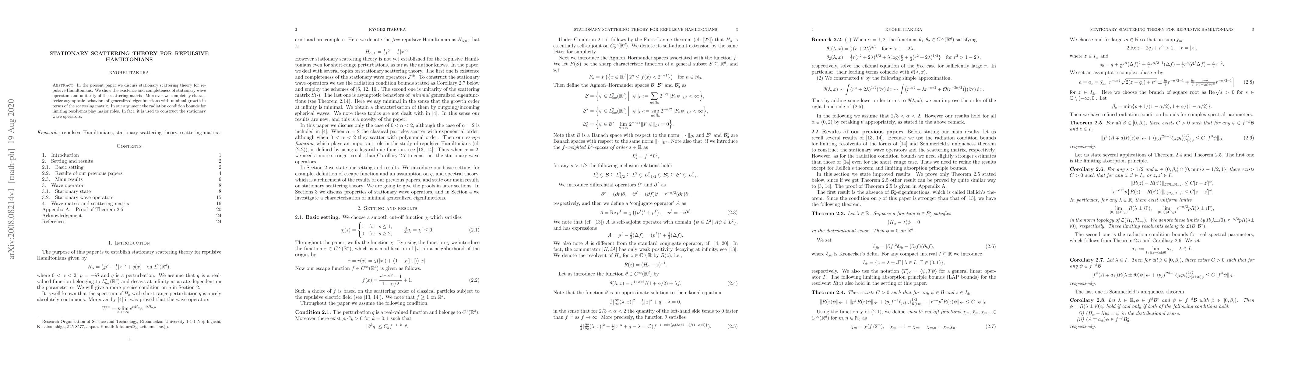 This paper establishes the existence and completeness of stationary wave operators and the unitarity of the scattering matrix for repulsive Hamiltonians, characterizing the asymptotic behavior of generalized eigenfunctions using the scattering matrix and radiation condition bounds.