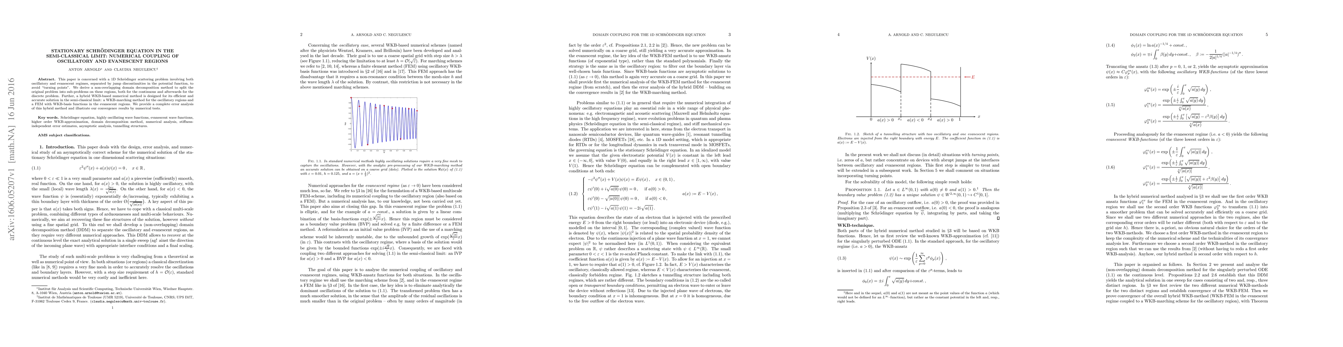 This paper is concerned with a 1D Schr\"odinger scattering problem involving both oscillatory and evanescent regimes, separated by jump discontinuities in the potential function, to avoid "turning points". We derive a non-overlapping domain decomposition method to split the original problem into sub-problems on these regions, both for the continuous and afterwards for the discrete problem. Further, a hybrid WKB-based numerical method is designed for its efficient and accurate solution in the semi-classical limit: a WKB-marching method for the oscillatory regions and a FEM with WKB-basis functions in the evanescent regions. We provide a complete error analysis of this hybrid method and illustrate our convergence results by numerical tests.