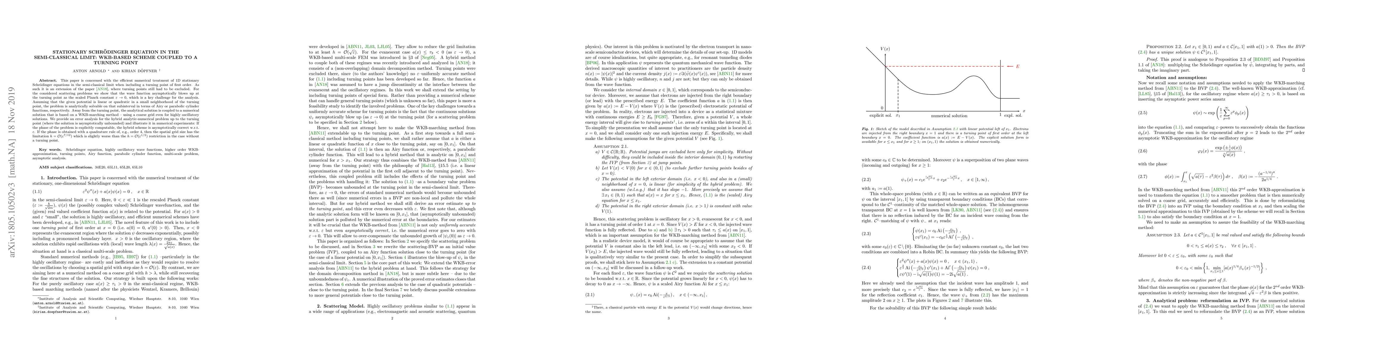 This paper develops a numerical method for solving 1D stationary Schrödinger equations in the semi-classical limit with a turning point, combining analytical solutions near the turning point with a WKB-based numerical scheme.