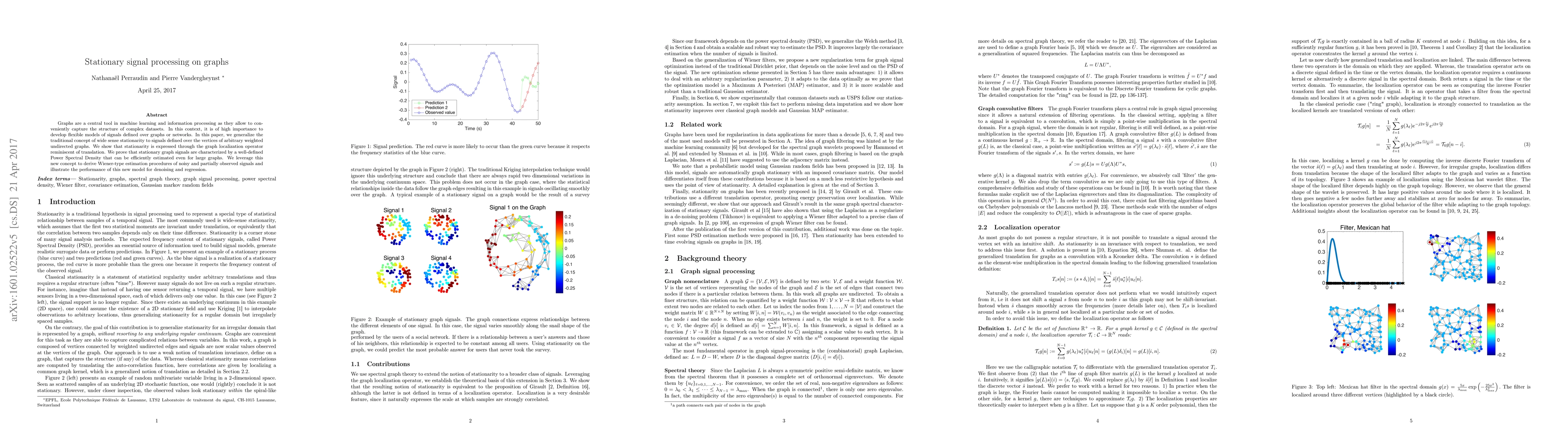 Graphs are a central tool in machine learning and information processing as they allow to conveniently capture the structure of complex datasets. In this context, it is of high importance to develop flexible models of signals defined over graphs or networks. In this paper, we generalize the traditional concept of wide sense stationarity to signals defined over the vertices of arbitrary weighted undirected graphs. We show that stationarity is expressed through the graph localization operator reminiscent of translation. We prove that stationary graph signals are characterized by a well-defined Power Spectral Density that can be efficiently estimated even for large graphs. We leverage this new concept to derive Wiener-type estimation procedures of noisy and partially observed signals and illustrate the performance of this new model for denoising and regression.
