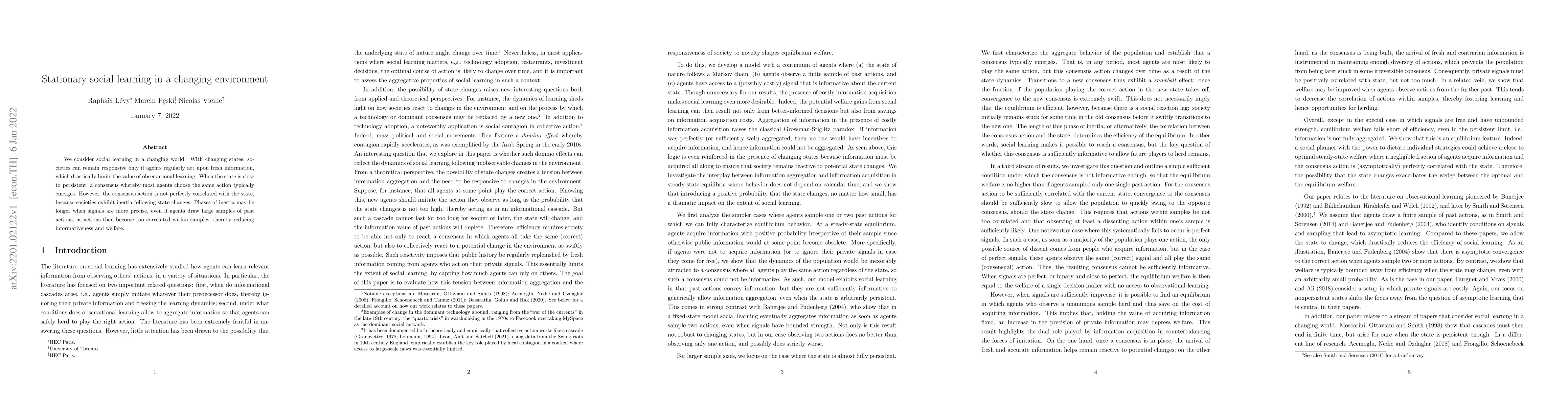 We consider social learning in a changing world. Society can remain responsive to state changes only if agents regularly act upon fresh information, which limits the value of social learning. When the state is close to persistent, a consensus whereby most agents choose the same action typically emerges. The consensus action is not perfectly correlated with the state though, because the society exhibits inertia following state changes. Phases of inertia may be longer when signals are more precise, even if agents draw large samples of past actions, as actions then become too correlated within samples, thereby reducing informativeness and welfare.