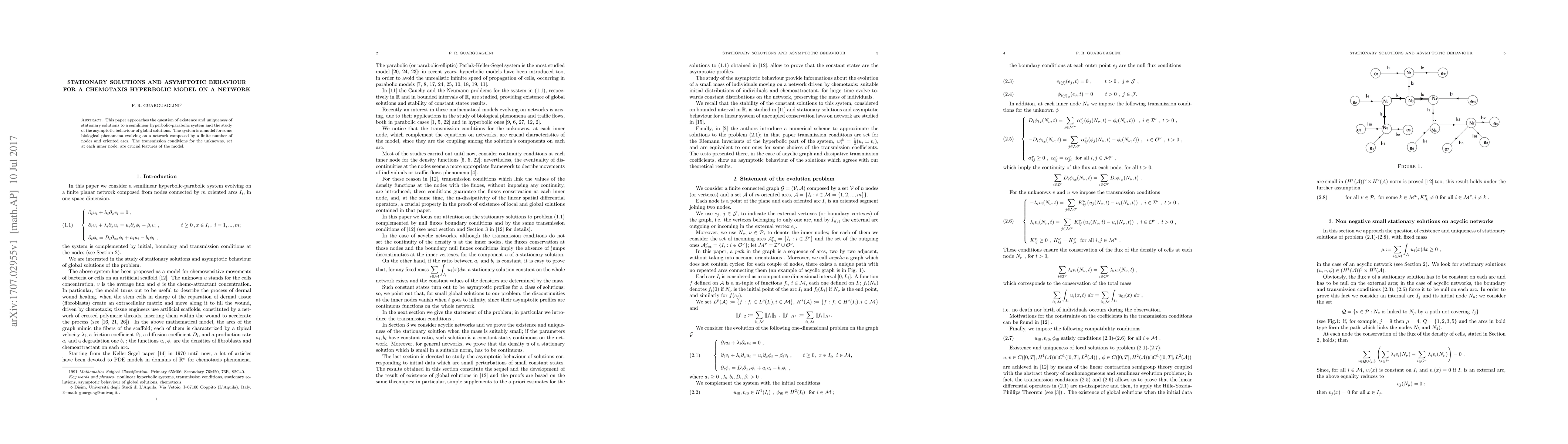 This paper approaches the question of existence and uniqueness of stationary solutions to a semilinear hyperbolic-parabolic system and the study of the asymptotic behaviour of global solutions. The system is a model for some biological phenomena evolving on a network composed by a finite number of nodes and oriented arcs. The transmission conditions for the unknowns, set at each inner node, are crucial features of the model.