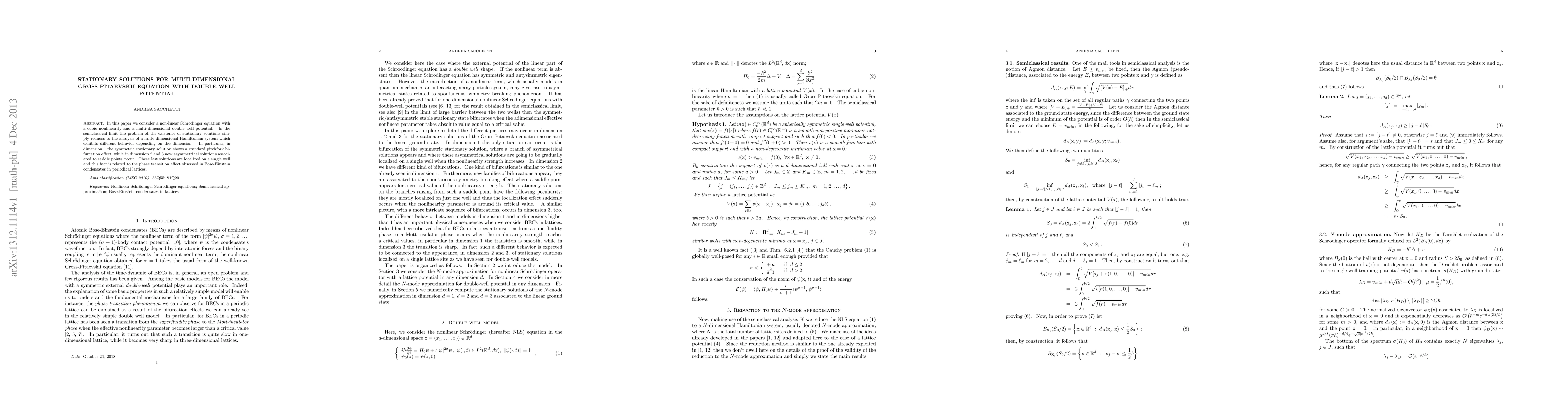 In this paper we consider a non-linear Schroedinger equation with a cubic nonlinearity and a multi-dimensional double well potential. In the semiclassical limit the problem of the existence of stationary solutions simply reduces to the analysis of a finite dimensional Hamiltonian system which exhibits different behavior depending on the dimension. In particular, in dimension 1 the symmetric stationary solution shows a standard pitchfork bifurcation effect, while in dimension 2 and 3 new asymmetrical solutions associated to saddle points occur. These last solutions are localized on a single well and this fact is related to the phase transition effect observed in Bose-Einstein condensates in periodical lattices.