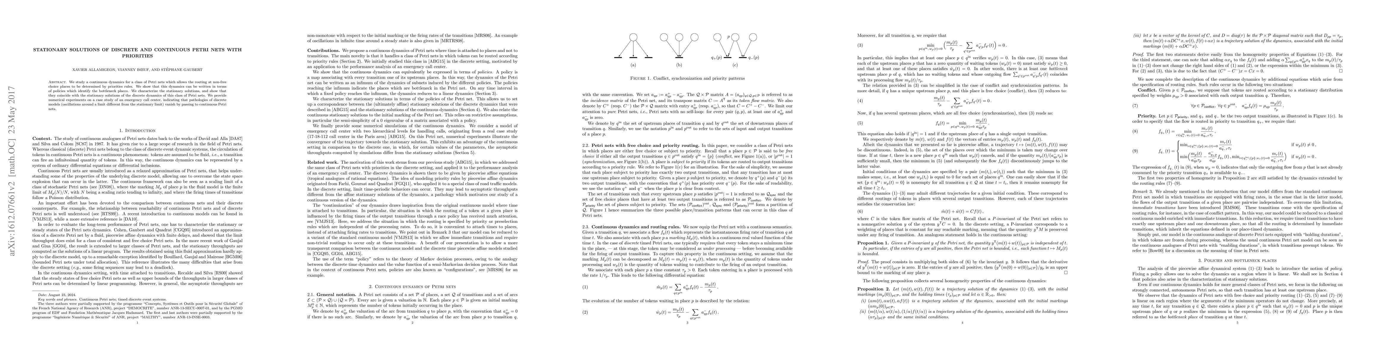 This paper explores continuous dynamics in Petri nets with priority rules, demonstrating that stationary solutions align with those of the discrete dynamics. Numerical experiments on an emergency call center show that continuous models mitigate discrete model pathologies like oscillations.