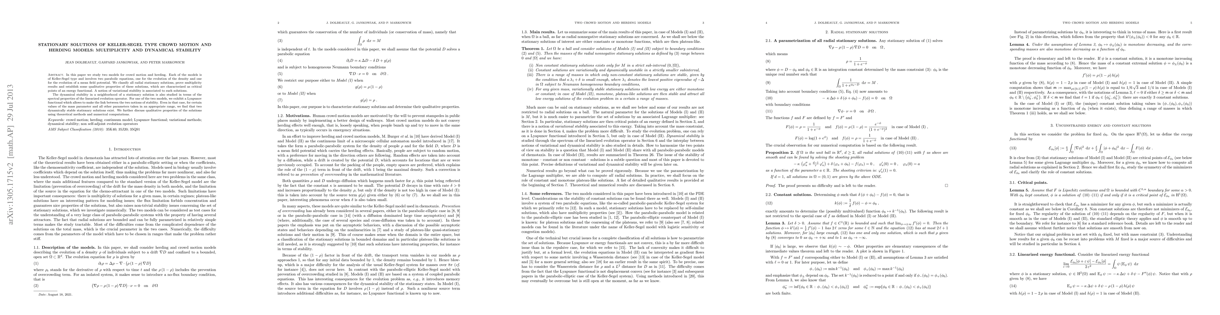 Researchers study two crowd motion models, finding that some have multiple stable solutions and exhibit dynamical stability, with certain conditions allowing for two stable states to coexist.