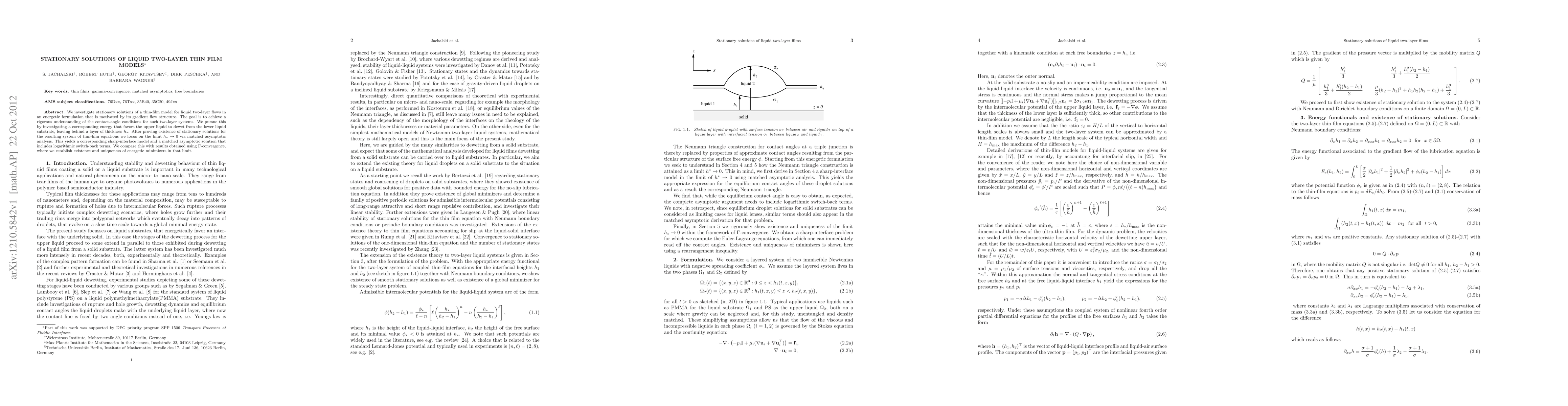 This paper investigates stationary solutions for a thin-film model describing liquid two-layer flows, focusing on rigorous contact-angle conditions and the dewetting process. It derives a sharp-interface model via matched asymptotic analysis and confirms existence and uniqueness of energetic minimizers using $\Gamma$-convergence.