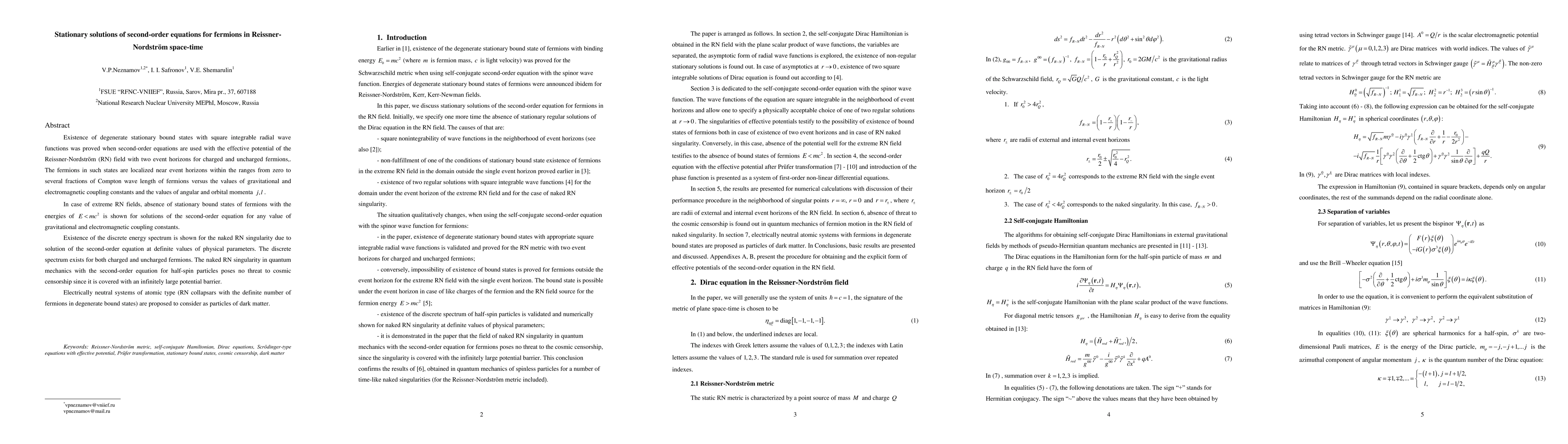 This paper proves the existence of degenerate stationary bound states for fermions in Reissner-Nordström space-time using second-order equations, showing localized states near event horizons. It also demonstrates the absence of such states for extreme Reissner-Nordström fields and proposes atomic-type RN collapsars as dark matter candidates.