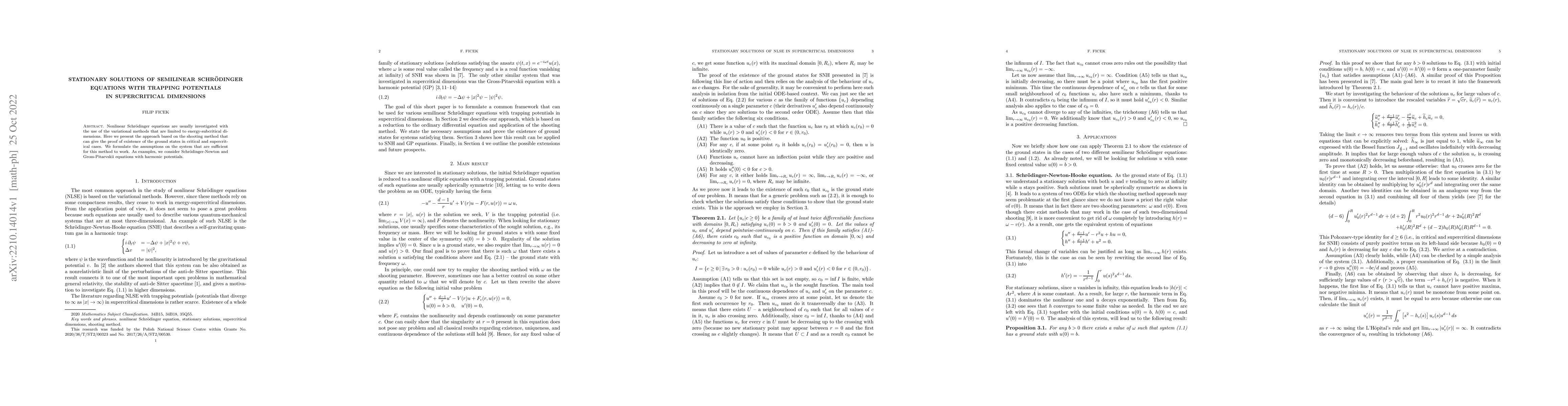 Nonlinear Schr\"odinger equations are usually investigated with the use of the variational methods that are limited to energy-subcritical dimensions. Here we present the approach based on the shooting method that can give the proof of existence of the ground states in critical and supercritical cases. We formulate the assumptions on the system that are sufficient for this method to work. As examples, we consider Schr\"odinger-Newton and Gross-Pitaevskii equations with harmonic potentials.
