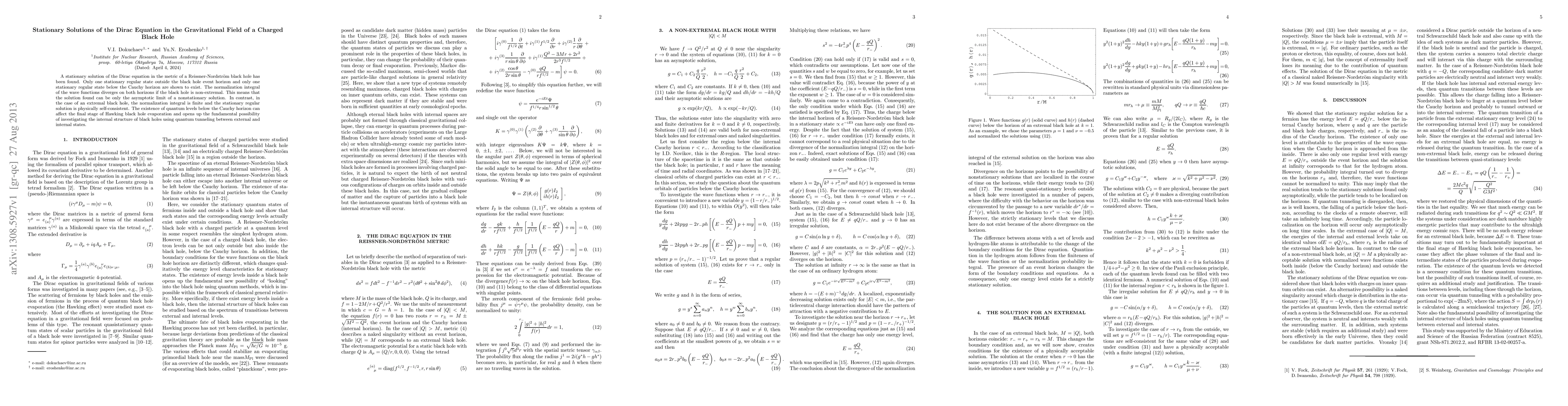 A stationary solution of the Dirac equation in the metric of a Reissner-Nordstrom black hole has been found. Only one stationary regular state outside the black hole event horizon and only one stationary regular state below the Cauchy horizon are shown to exist. The normalization integral of the wave functions diverges on both horizons if the black hole is non-extremal. This means that the solution found can be only the asymptotic limit of a nonstationary solution. In contrast, in the case of an extremal black hole, the normalization integral is finite and the stationary regular solution is physically self-consistent. The existence of quantum levels below the Cauchy horizon can affect the final stage of Hawking black hole evaporation and opens up the fundamental possibility of investigating the internal structure of black holes using quantum tunneling between external and internal states.
