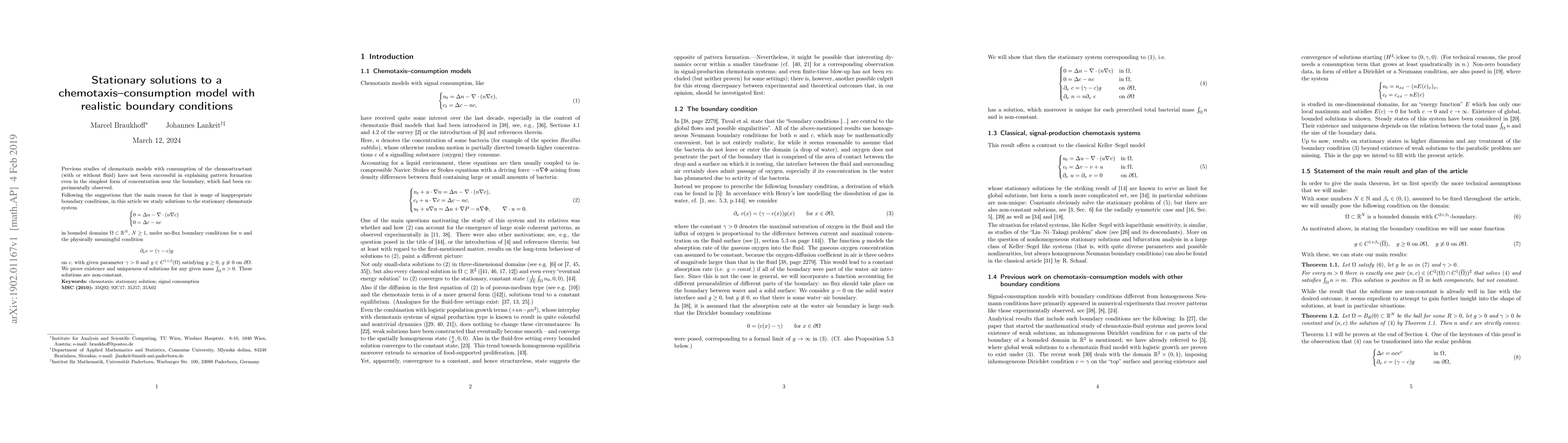Previous studies of chemotaxis models with consumption of the chemoattractant (with or without fluid) have not been successful in explaining pattern formation even in the simplest form of concentration near the boundary, which had been experimentally observed. Following the suggestions that the main reason for that is usage of inappropriate boundary conditions, in this article we study solutions to the stationary chemotaxis system \[ \begin{cases} 0 = \Delta n - \nabla\cdot(n\nabla c) \\ 0 = \Delta c - nc \end{cases} \] in bounded domains $\Omega\subset\mathbb{R}^N$, $N\ge 1$, under no-flux boundary conditions for $n$ and the physically meaningful condition \[ \partial_{\nu} c = (\gamma-c)g \] on $c$, with given parameter $\gamma>0$ and $g\in C^{1+\beta}(\Omega)$ satisfying $g\ge 0$, $g \not\equiv 0$ on $\partial \Omega$. We prove existence and uniqueness of solutions for any given mass $\int_\Omega n > 0$. These solutions are non-constant.
