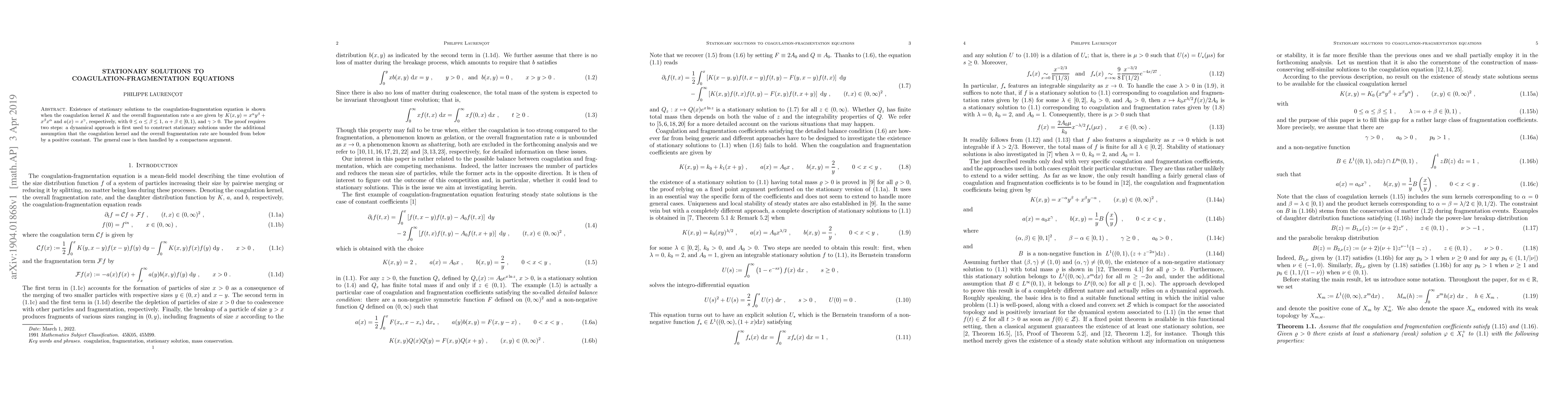 This paper demonstrates the existence of stationary solutions for coagulation-fragmentation equations under specific forms of the coagulation kernel and fragmentation rate. The proof employs a dynamical approach followed by a compactness argument to handle the general case.