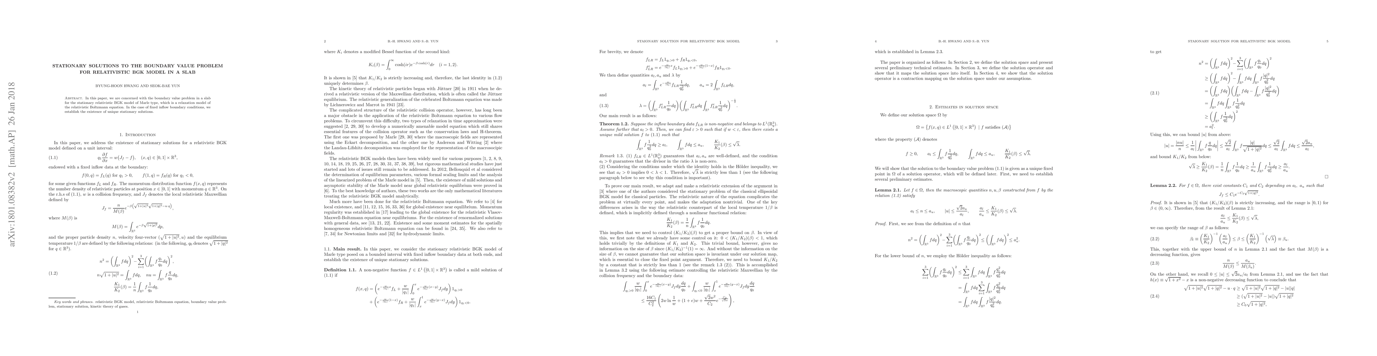 Summary: This paper investigates the stationary relativistic BGK model in a slab under fixed inflow boundary conditions, proving the existence and uniqueness of such solutions. The focus is on the relativistic Boltzmann equation's relaxation model of Marle type.