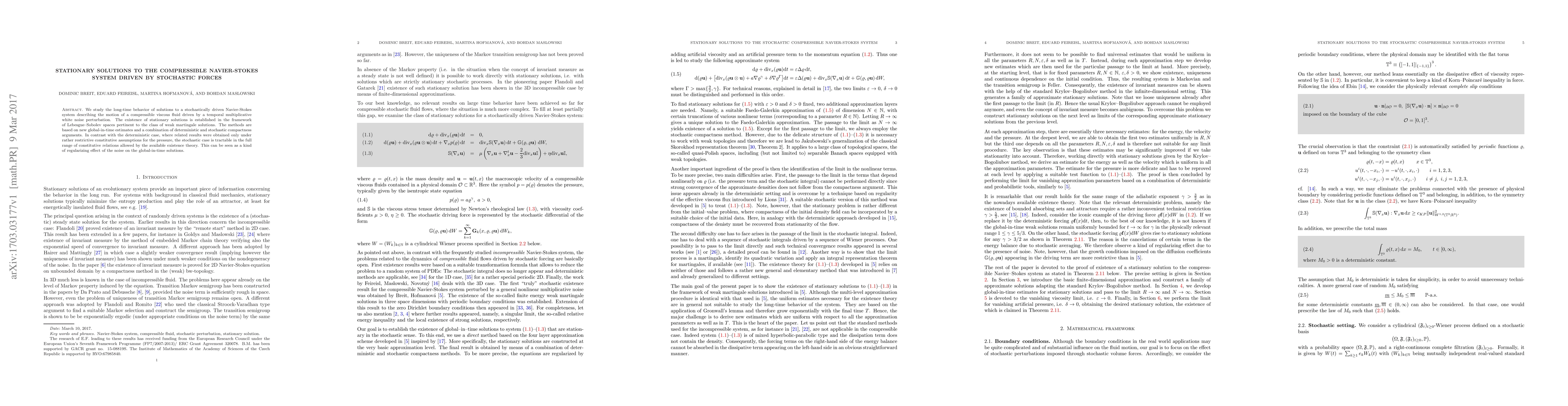 We study the long-time behavior of solutions to a stochastically driven Navier-Stokes system describing the motion of a compressible viscous fluid driven by a temporal multiplicative white noise perturbation. The existence of stationary solutions is established in the framework of Lebesgue--Sobolev spaces pertinent to the class of weak martingale solutions. The methods are based on new global-in-time estimates and a combination of deterministic and stochastic compactness arguments. In contrast with the deterministic case, where related results were obtained only under rather restrictive constitutive assumptions for the pressure, the stochastic case is tractable in the full range of constitutive relations allowed by the available existence theory. This can be seen as a kind of regularizing effect of the noise on the global-in-time solutions.