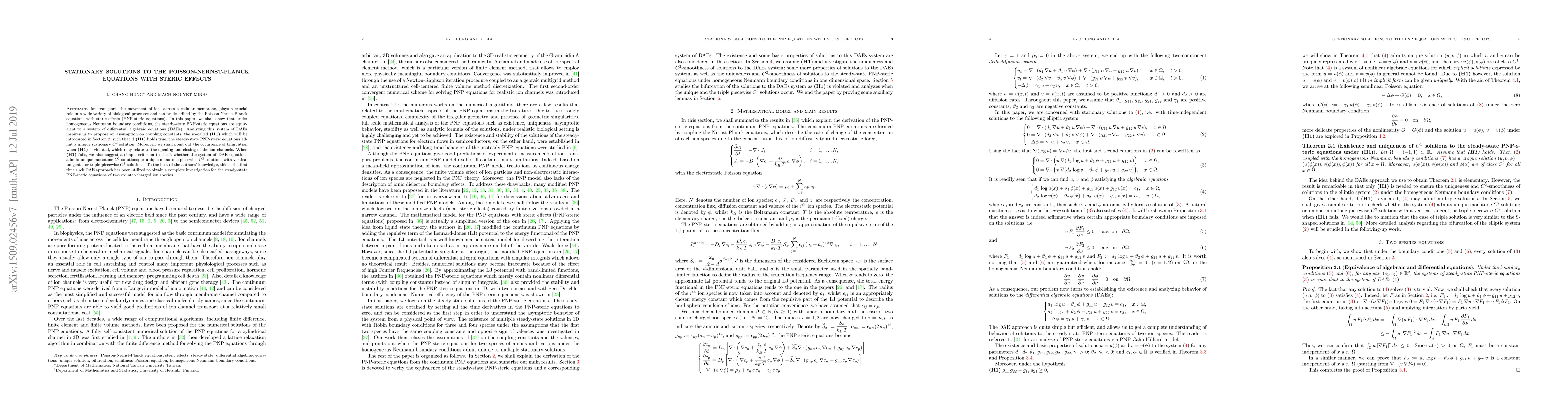 This paper investigates stationary solutions to the Poisson-Nernst-Planck equations with steric effects, showing that under certain boundary conditions, the equations reduce to a system of differential algebraic equations (DAEs). The authors propose an assumption (H1) ensuring the existence of a unique stationary solution, and discuss bifurcation phenomena when this assumption fails, potentially linking to ion channel behavior.