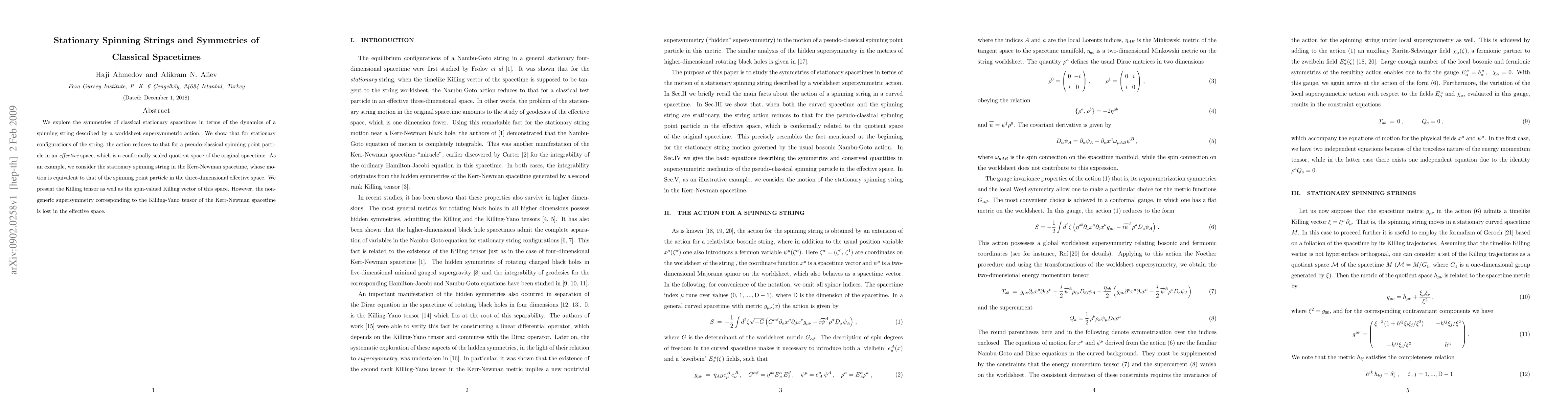This paper investigates the symmetries of stationary classical spacetimes through the dynamics of a spinning string, demonstrating that its stationary configurations reduce to a pseudo-classical spinning point particle in an effective space. It exemplifies this with the Kerr-Newman spacetime, showing the equivalence of the spinning string's motion to the spinning point particle in a three-dimensional effective space, though it loses the nongeneric supersymmetry associated with the Killing-Yano tensor.