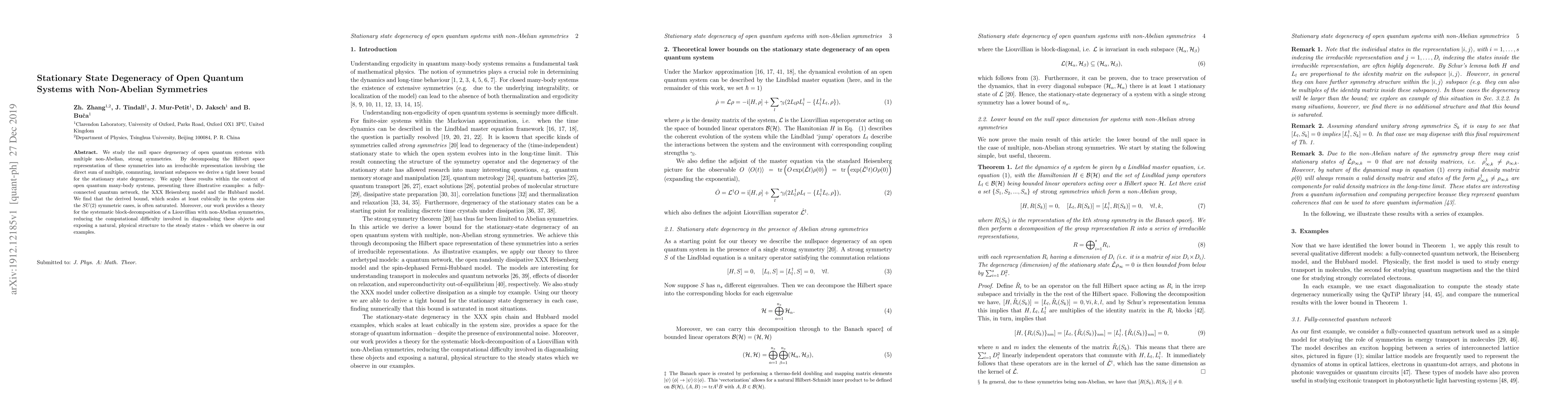 This paper investigates the stationary state degeneracy in open quantum systems with multiple non-Abelian symmetries, deriving a tight lower bound for such degeneracies. It applies this theory to three examples, showing that the bound often scales cubically with system size and is frequently realized.