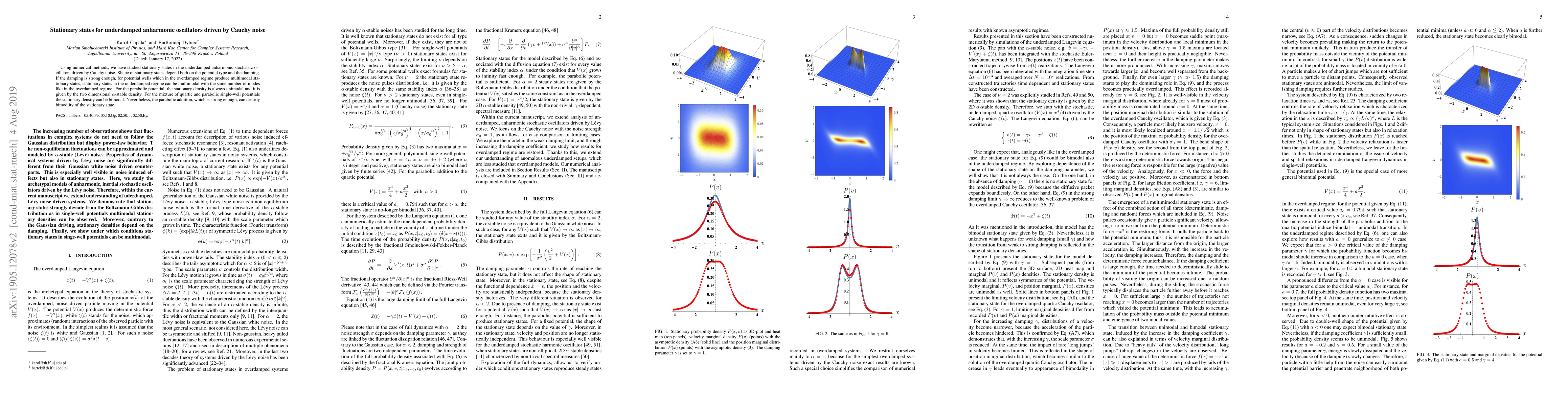 This paper investigates stationary states in underdamped anharmonic oscillators subjected to Cauchy noise, revealing that the shape of these states depends on both potential type and damping. Strong damping can maintain multimodality seen in overdamped regimes, while parabolic potentials always yield unimodal stationary densities described by $\alpha$-stable densities.