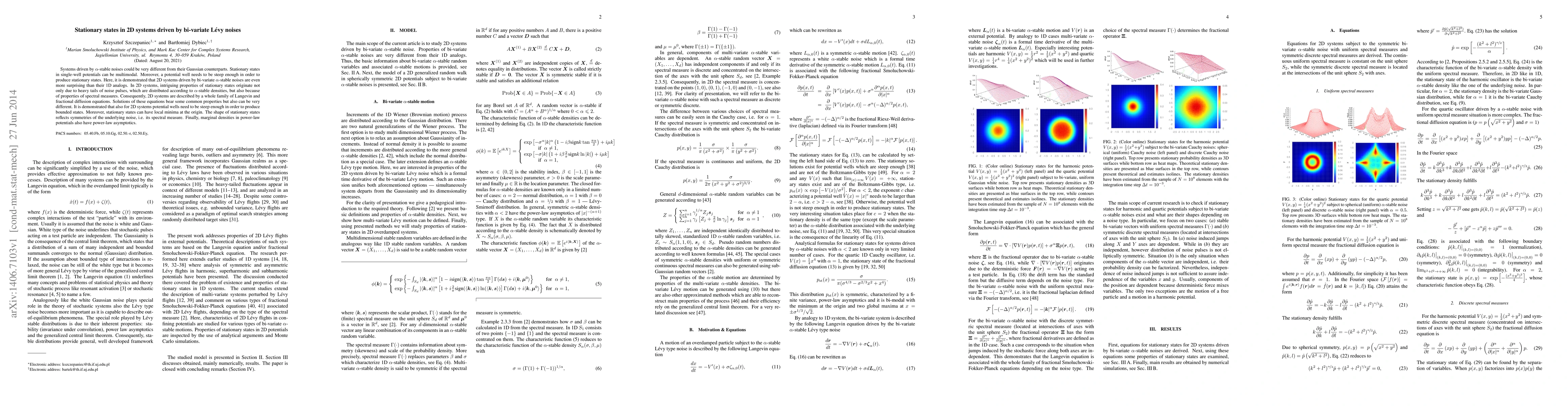 Systems driven by $\alpha$-stable noises could be very different from their Gaussian counterparts. Stationary states in single-well potentials can be multimodal. Moreover, a potential well needs to be steep enough in order to produce stationary states. Here, it is demonstrated that 2D systems driven by bi-variate $\alpha$-stable noises are even more surprising than their 1D analogs. In 2D systems, intriguing properties of stationary states originate not only due to heavy tails of noise pulses, which are distributed according to $\alpha$-stable densities, but also because of properties of spectral measures. Consequently, 2D systems are described by a whole family of Langevin and fractional diffusion equations. Solutions of these equations bear some common properties but also can be very different. It is demonstrated that also for 2D systems potential wells need to be steep enough in order to produce bounded states. Moreover, stationary states can have local minima at the origin. The shape of stationary states reflects symmetries of the underlying noise, i.e. its spectral measure. Finally, marginal densities in power-law potentials also have power-law asymptotics.