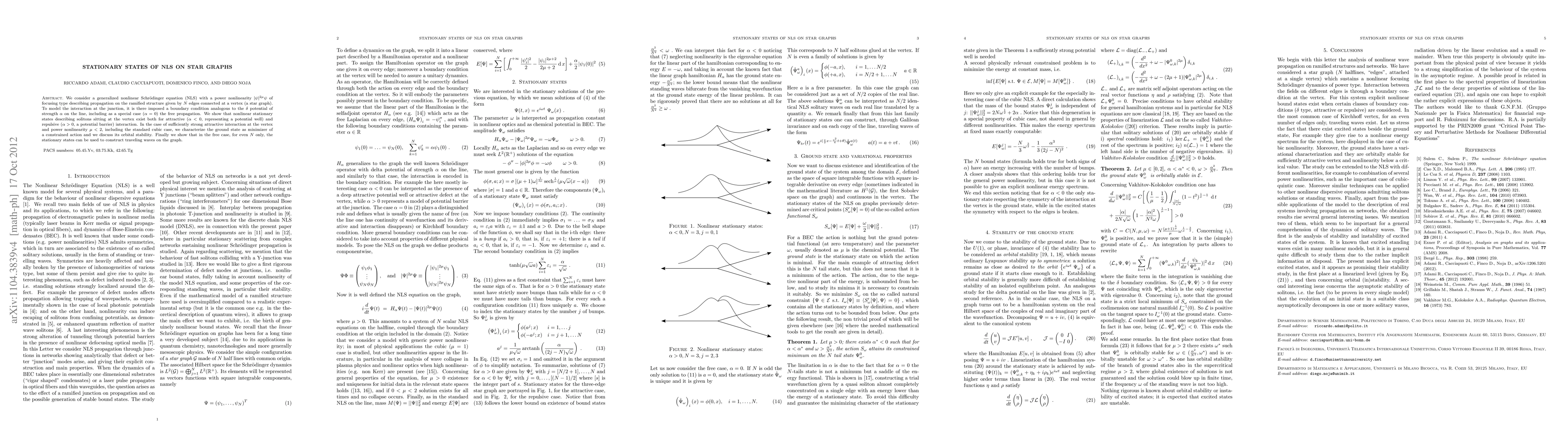 We consider a generalized nonlinear Schr\"odinger equation (NLS) with a power nonlinearity |\psi|^2\mu\psi, of focusing type, describing propagation on the ramified structure given by N edges connected at a vertex (a star graph). To model the interaction at the junction, it is there imposed a boundary condition analogous to the \delta potential of strength \alpha on the line, including as a special case (\alpha=0) the free propagation. We show that nonlinear stationary states describing solitons sitting at the vertex exist both for attractive (\alpha<0, representing a potential well) and repulsive (\alpha>0, a potential barrier) interaction. In the case of sufficiently strong attractive interaction at the vertex and power nonlinearity \mu<2, including the standard cubic case, we characterize the ground state as minimizer of a constrained action and we discuss its orbital stability. Finally we show that in the free case, for even N only, the stationary states can be used to construct traveling waves on the graph.