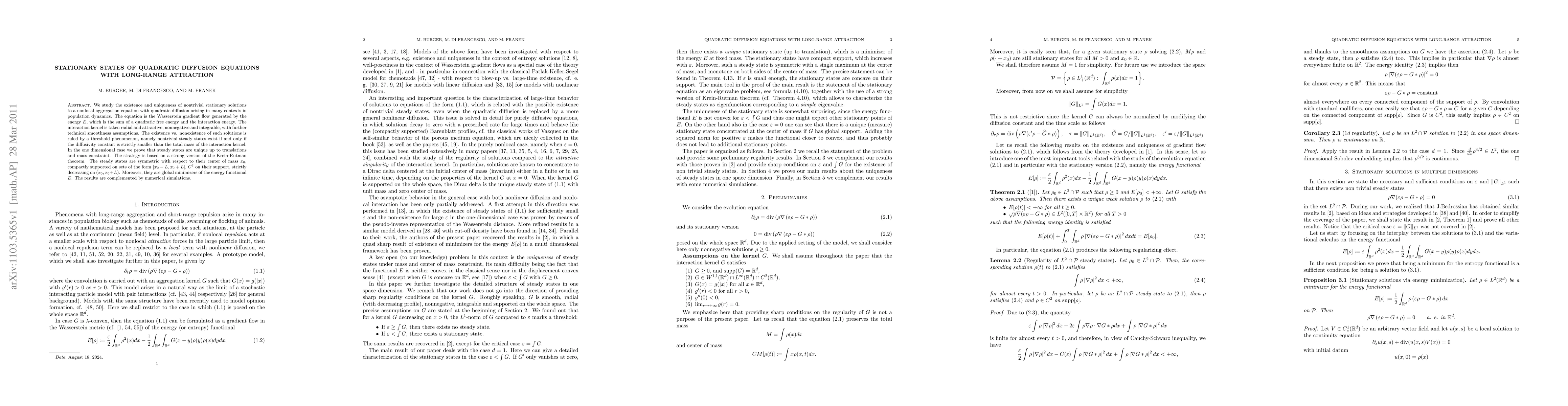 This paper investigates the existence and uniqueness of nontrivial stationary solutions for a nonlocal aggregation equation with quadratic diffusion, revealing a threshold phenomenon where steady states exist if the diffusivity constant is less than the total mass of the interaction kernel. In one dimension, steady states are shown to be unique up to translations and mass constraints, symmetric, compactly supported, and global minimizers of the energy functional.