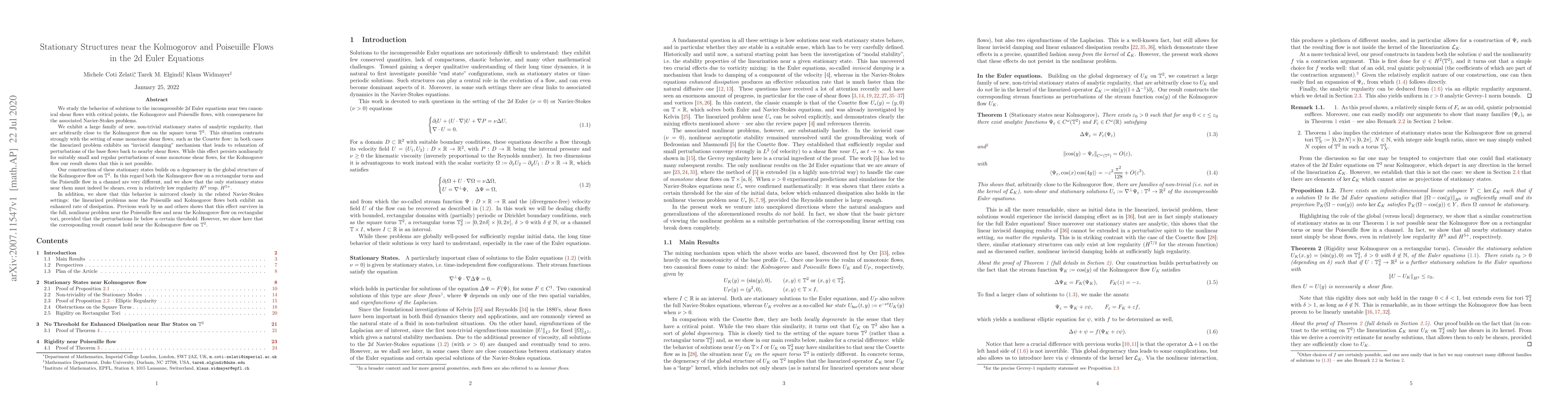 We study the behavior of solutions to the incompressible $2d$ Euler equations near two canonical shear flows with critical points, the Kolmogorov and Poiseuille flows, with consequences for the associated Navier-Stokes problems. We exhibit a large family of new, non-trivial stationary states of analytic regularity, that are arbitrarily close to the Kolmogorov flow on the square torus $\mathbb{T}^2$. This situation contrasts strongly with the setting of some monotone shear flows, such as the Couette flow: in both cases the linearized problem exhibits an "inviscid damping" mechanism that leads to relaxation of perturbations of the base flows back to nearby shear flows. While this effect persists nonlinearly for suitably small and regular perturbations of some monotone shear flows, for the Kolmogorov flow our result shows that this is not possible. Our construction of these stationary states builds on a degeneracy in the global structure of the Kolmogorov flow on $\mathbb{T}^2$. In this regard both the Kolmogorov flow on a rectangular torus and the Poiseuille flow in a channel are very different, and we show that the only stationary states near them must indeed be shears, even in relatively low regularity $H^3$ resp. $H^{5+}$. In addition, we show that this behavior is mirrored closely in the related Navier-Stokes settings: the linearized problems near the Poiseuille and Kolmogorov flows both exhibit an enhanced rate of dissipation. Previous work by us and others shows that this effect survives in the full, nonlinear problem near the Poiseuille flow and near the Kolmogorov flow on rectangular tori, provided that the perturbations lie below a certain threshold. However, we show here that the corresponding result cannot hold near the Kolmogorov flow on $\mathbb{T}^2$.