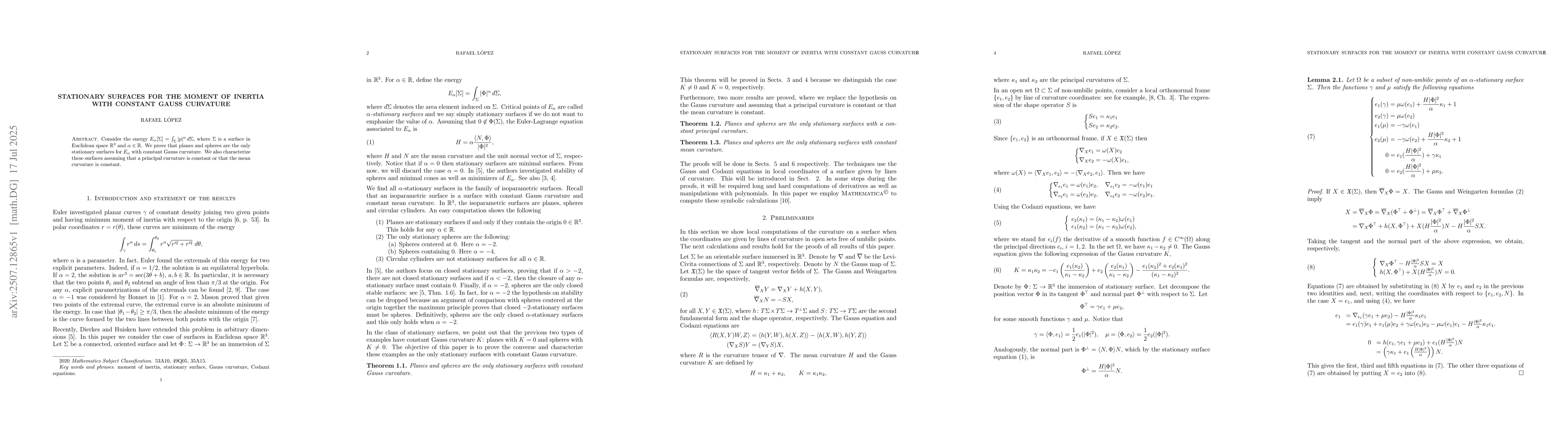 Consider the energy $E_\alpha[\Sigma]=\int_\Sigma |p|^\alpha\, d\Sigma$, where $\Sigma$ is a surface in Euclidean space $\r^3$ and $\alpha\in\r$. We prove that planes and spheres are the only stationary surfaces for $E_\alpha$ with constant Gauss curvature. We also characterize these surfaces assuming that a principal curvature is constant or that the mean curvature is constant.