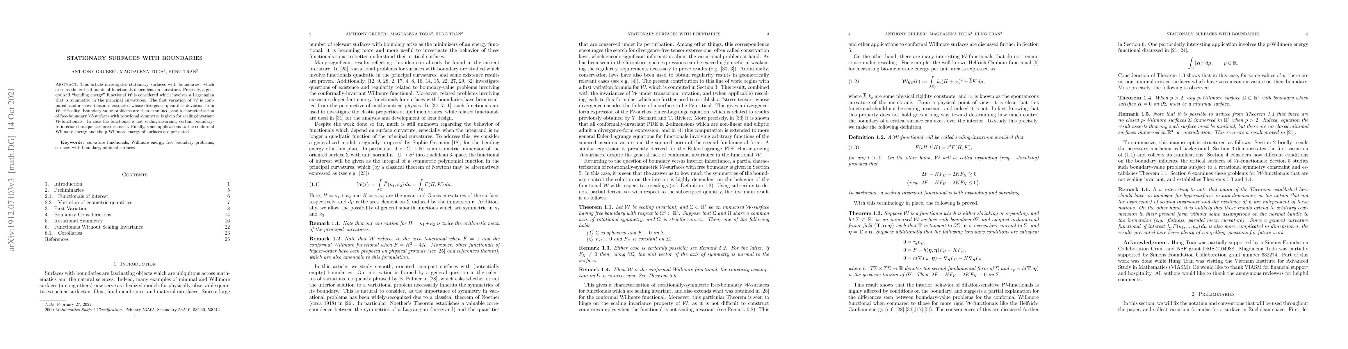 This article investigates stationary surfaces with boundaries, which arise as the critical points of functionals dependent on curvature. Precisely, a generalized "bending energy" functional $\mathcal{W}$ is considered which involves a Lagrangian that is symmetric in the principal curvatures. The first variation of $\mathcal{W}$ is computed, and a stress tensor is extracted whose divergence quantifies deviation from $\mathcal{W}$-criticality. Boundary-value problems are then examined, and a characterization of free-boundary $\mathcal{W}$-surfaces with rotational symmetry is given for scaling-invariant $\mathcal{W}$-functionals. In case the functional is not scaling-invariant, certain boundary-to-interior consequences are discussed. Finally, some applications to the conformal Willmore energy and the p-Willmore energy of surfaces are presented.