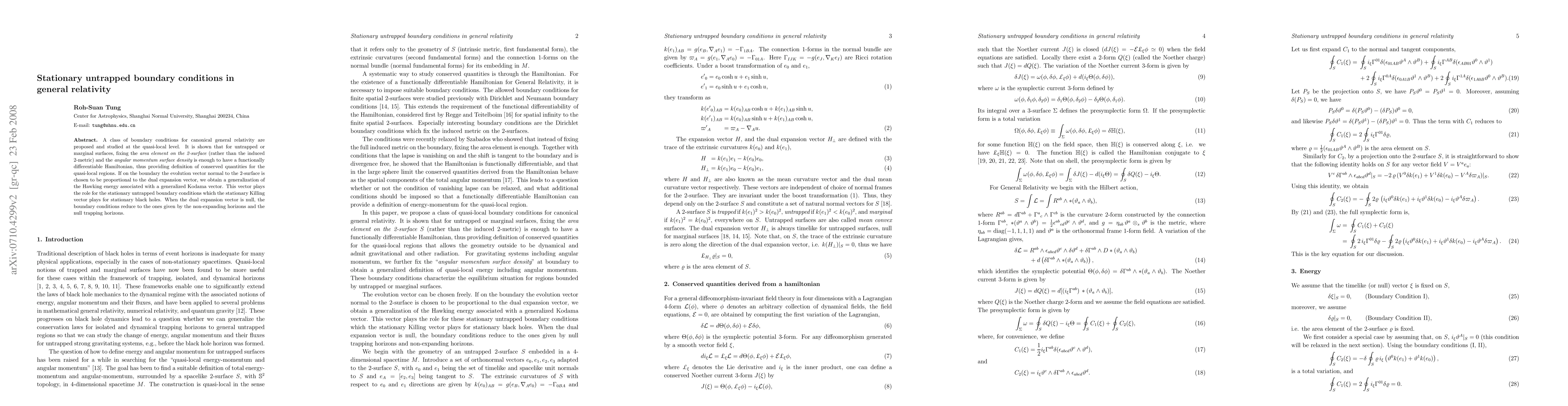 The paper introduces a novel set of stationary untrapped boundary conditions in general relativity, defines a generalized Hamiltonian, and derives a generalized Kodama vector for non-spherically symmetric spacetimes.
