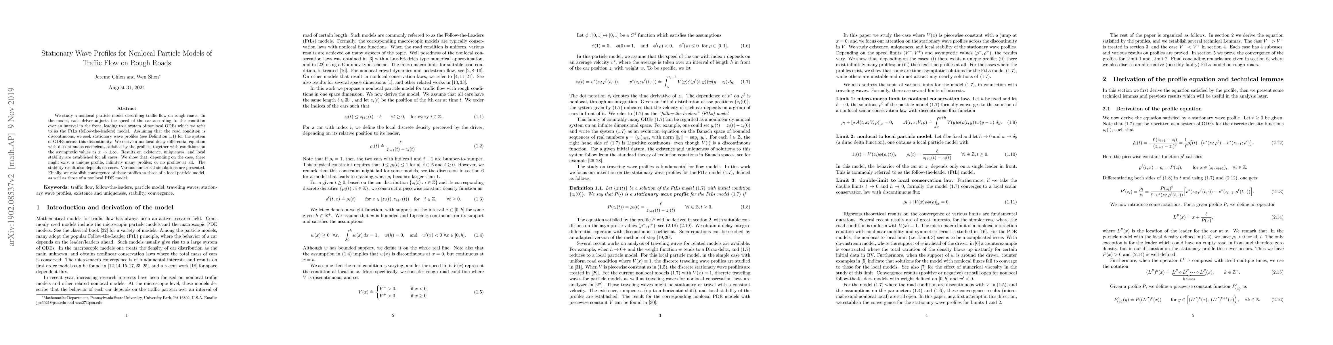We study a nonlocal particle model describing traffic flow on rough roads. In the model, each driver adjusts the speed of the car according to the condition over an interval in the front, leading to a system of nonlocal ODEs which we refer to as the FtLs (follow-the-leaders) model. Assuming that the road condition is discontinuous at the origin, we seek stationary wave profiles (see Definition 1.1) for the system of ODEs across this discontinuity. We derive a non-local delay differential equation with discontinuous coefficient, satisfied by the profiles, together with conditions on the asymptotic values as $x\to\pm\infty$. Results on existence, uniqueness, and local stability are proved, for all cases. We show that, depending on the case, there might exist a unique profile, infinitely many profiles, or no profiles. The stability result also depends on cases. Various numerical simulations are presented. Finally, we establish convergence of these profiles to those of a local particle model, as well as those of a nonlocal PDE model.