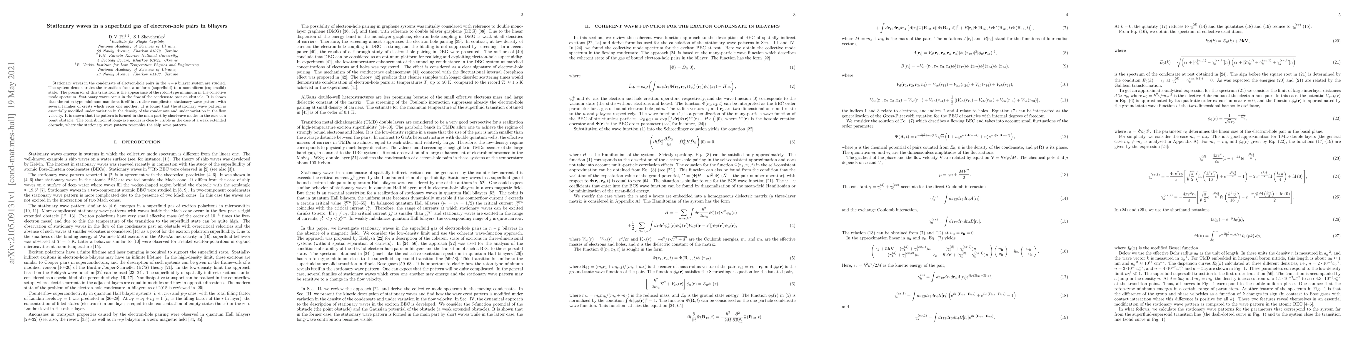 This paper investigates stationary waves in a superfluid gas of electron-hole pairs in bilayer systems, revealing a transition from a uniform to a nonuniform state marked by a roton-type minimum. The study finds complex wave patterns influenced by condensate density and flow velocity, with shortwave modes dominating around point obstacles and longwave modes visible near weak extended obstacles.