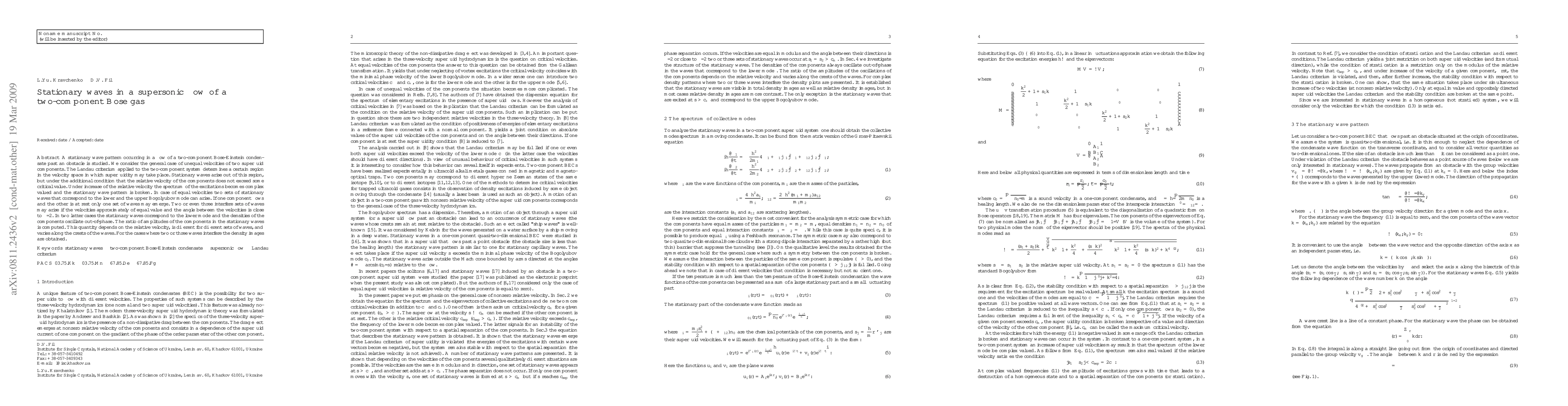 A stationary wave pattern occurring in a flow of a two-component Bose-Einstein condensate past an obstacle is studied. We consider the general case of unequal velocities of two superfluid components. The Landau criterium applied to the two-component system determines a certain region in the velocity space in which superfluidity may take place. Stationary waves arise out of this region, but under the additional condition that the relative velocity of the components does not exceed some critical value. Under increase of the relative velocity the spectrum of the excitations becomes complex valued and the stationary wave pattern is broken. In case of equal velocities two sets of stationary waves that correspond to the lower and the upper Bogolyubov mode can arise. If one component flows and the other is at rest only one set of waves may emerge. Two or even three interfere sets of waves may arise if the velocities approximately of equal value and the angle between the velocities is close to pi/2. In two latter cases the stationary waves correspond to the lower mode and the densities of the components oscillate out-of-phase. The ratio of amplitudes of the components in the stationary waves is computed. This quantity depends on the relative velocity, is different for different sets of waves, and varies along the crests of the waves. For the cases where two or three waves interfere the density images are obtained.