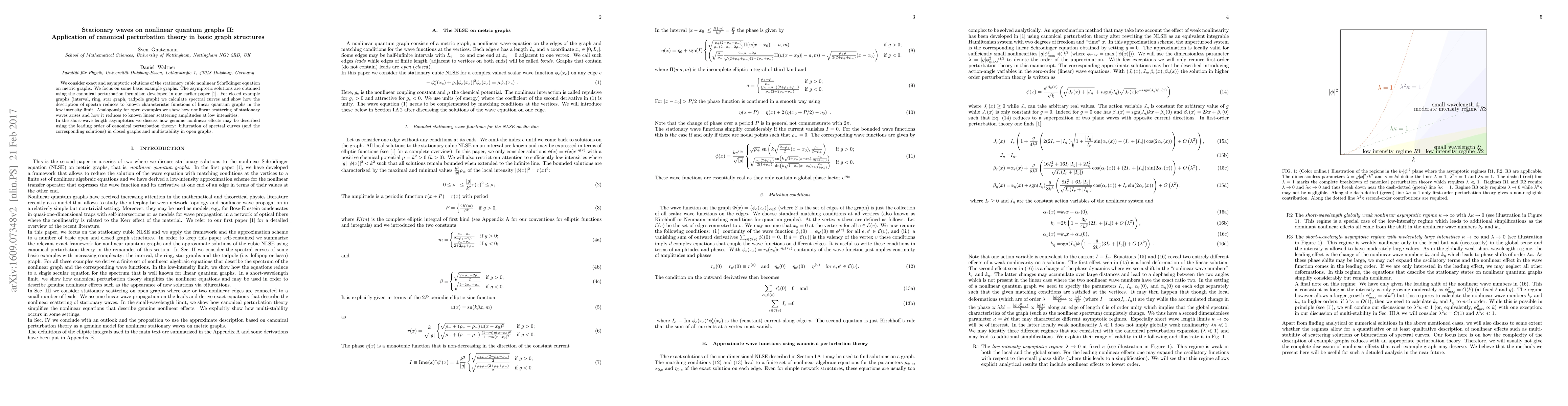 We consider exact and asymptotic solutions of the stationary cubic nonlinear Schr\"odinger equation (NLSE) on metric graphs. We focus on some basic example graphs. The asymptotic solutions are obtained using the canonical perturbation formalism developed in our earlier paper \cite{paper1}. For closed example graphs (interval, ring, star graph, tadpole graph) we calculate spectral curves and show how the description of spectra reduces to known characteristic functions of linear quantum graphs in the low intensity limit. Analogously for open examples we show how nonlinear scattering of stationary waves arises and how it reduces to known linear scattering amplitudes at low intensities. In the short-wave length asymptotics we discuss how genuine nonlinear effects such as may be described using the leading order of canonical perturbation theory: bifurcation of spectral curves (and the corresponding solutions) in closed graphs and multistability in open graphs.