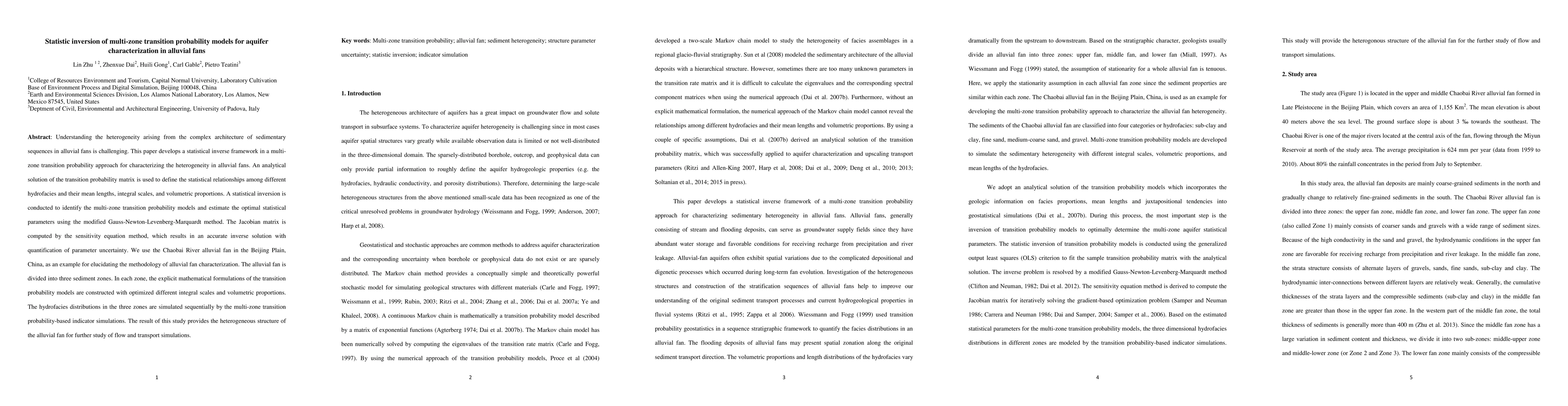 This paper develops a statistical inverse framework for characterizing the heterogeneity in alluvial fans using a multi-zone transition probability model. The study employs an analytical solution and the modified Gauss-Newton-Levenberg-Marquardt method to estimate optimal parameters, providing a detailed characterization of the Chaobai River alluvial fan in Beijing Plain, China.