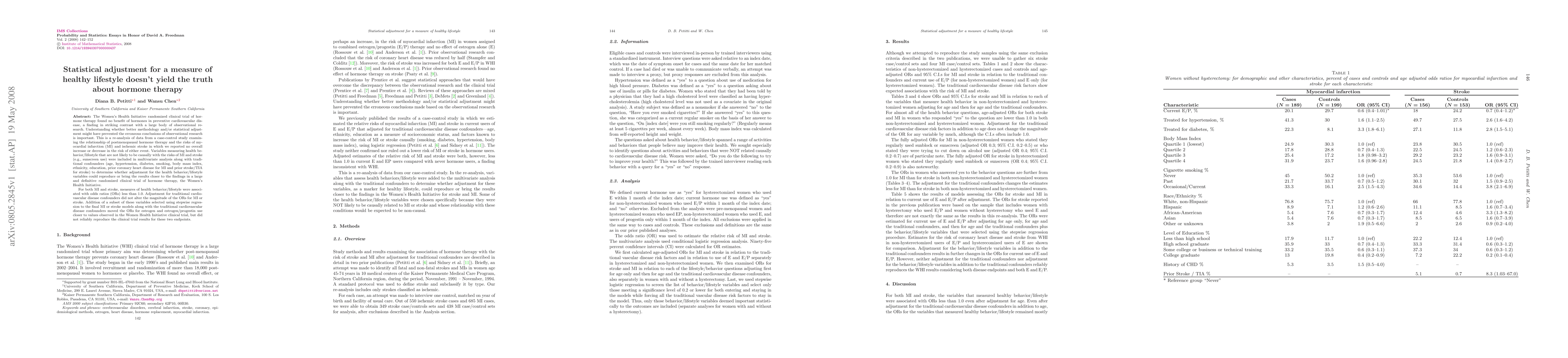 A re-analysis of hormone therapy data found that statistical adjustments for healthy lifestyle factors did not replicate the results of a large randomized clinical trial on cardiovascular disease prevention. Despite adjusting for potential confounding factors, lifestyle variables such as sunscreen use showed odds ratios less than 1.0, suggesting they were not causally linked to increased cardiovascular risk.