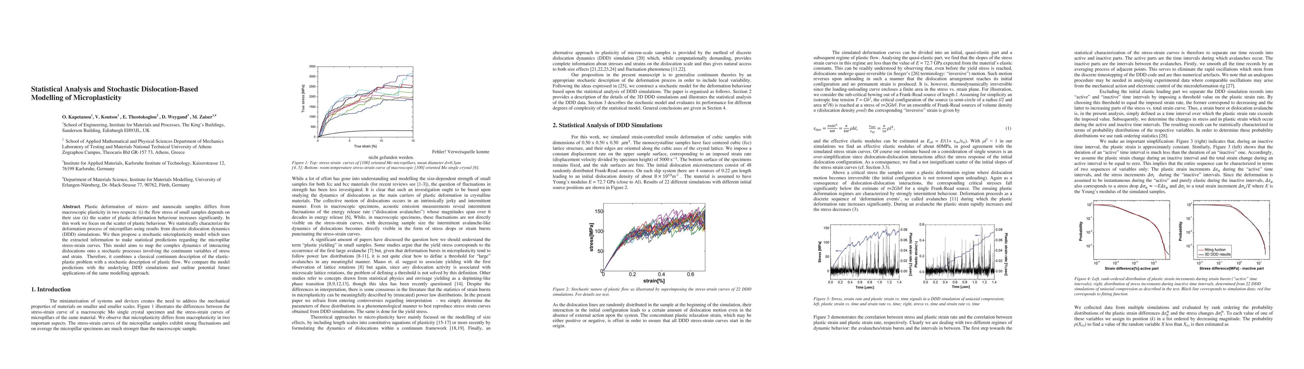 This paper statistically analyzes micropillar deformation under tension using discrete dislocation dynamics simulations, proposing a stochastic model to predict microplasticity behavior. The model integrates classical continuum mechanics with stochastic dislocation dynamics to account for increased scatter in microscale plasticity.