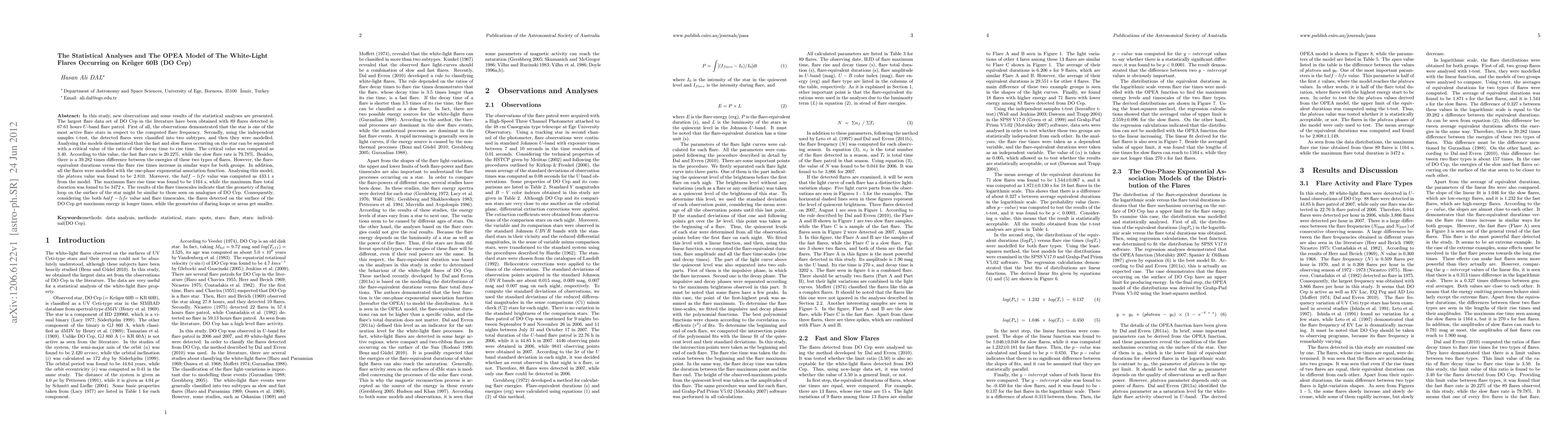 In this study, new observations and some results of statistical analyses are presented. The largest flare data set of DO Cep in the literature has been obtained with 89 flares detected in 67.61 hours of U-band flare patrol. First of all, the observations demonstrated that the star is one of the most active flare stars in respect to the computed flare frequency. Secondly, using the independent samples t-test, the detected flares were classified into two subtypes, and then they were modelled. Analysing the models demonstrated that the fast and slow flares occurring on the star can be separated with a critical value of the ratio of their decay time to rise time. The critical value was computed as 3.40. According to this value, the fast flare rate is 20.22%, while the slow flare rate is 79.78%. Besides, there is a 39.282 times difference between the energies of these two types of flares. However, the flare equivalent durations versus the flare rise times increase in similar ways for both groups. In addition, all all the flares were modelled with the one-phase exponential association function. Analysing this model, the plateau value was found to be 2.810. Moreover, the half-life value was computed as 433.1s from the model. The maximum flare rise time was found to be 1164s, while the maximum flare total duration was found to be 3472s. The results of the flare timescales indicate that the geometry of the flaring loop on the surface of the star might be similar to those seen on analogues of DO Cep. Consequently, considering both the half-life value and flare timescales, the flares detected on the surface of DO Cep get maximum energy in longer times, while the geometries of the flaring loops or areas get smaller.