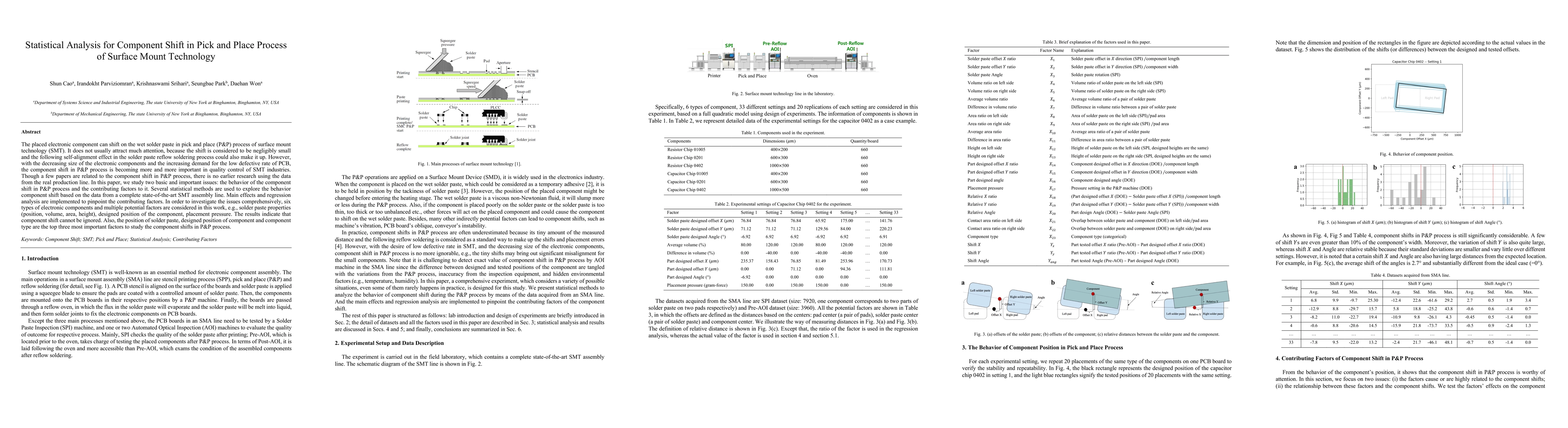 The placed electronic component can shift on the wet solder paste in pick and place (P&P) process of surface mount technology (SMT). It does not usually attract much attention, because the shift is considered to be negligibly small and the following self-alignment effect in the solder paste reflow soldering process could also make it up. However, with the decreasing size of the electronic components and the increasing demand for the low defective rate of PCB, the component shift in P&P process is becoming more and more important in quality control of SMT industries. Though a few papers are related to the component shift in P&P process, there is no earlier research using the data from the real production line. In this paper, we study two basic and important issues: the behavior of the component shift in P&P process and the contributing factors to it. Several statistical methods are used to explore the behavior component shift based on the data from a complete state-of-the-art SMT assembly line. Main effects and regression analysis are implemented to pinpoint the contributing factors. In order to investigate the issues comprehensively, six types of electronic components and multiple potential factors are considered in this work, e.g., solder paste properties (position, volume, area, height), designed position of the component, placement pressure. The results indicate that component shift cannot be ignored. Also, the position of solder paste, designed position of component and component type are the top three most important factors to study the component shifts in P&P process.