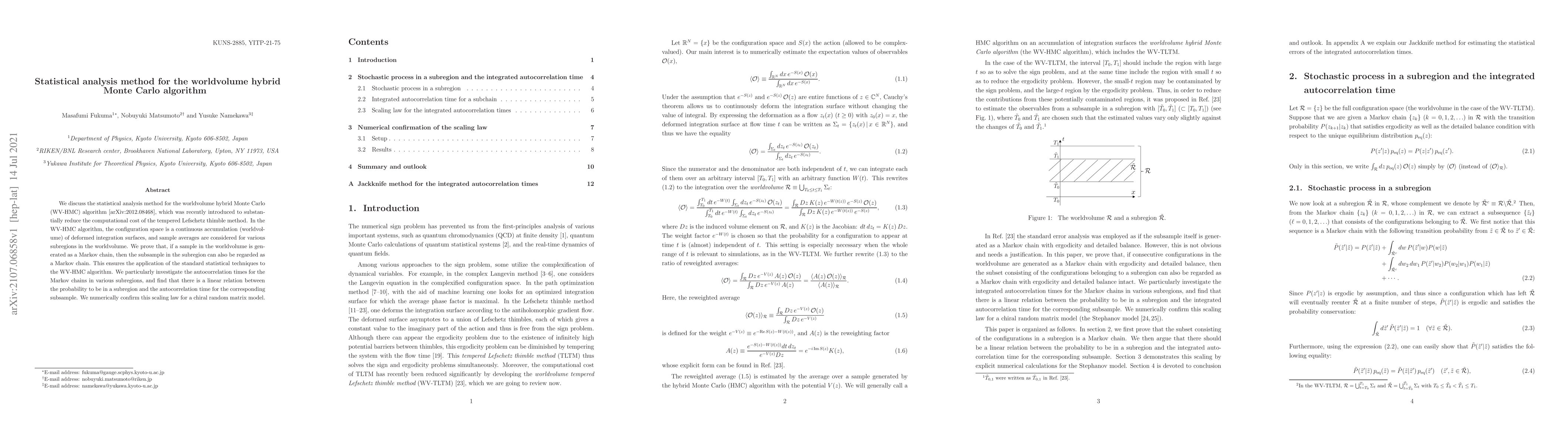 We discuss the statistical analysis method for the worldvolume hybrid Monte Carlo (WV-HMC) algorithm [arXiv:2012.08468], which was recently introduced to substantially reduce the computational cost of the tempered Lefschetz thimble method. In the WV-HMC algorithm, the configuration space is a continuous accumulation (worldvolume) of deformed integration surfaces, and sample averages are considered for various subregions in the worldvolume. We prove that, if a sample in the worldvolume is generated as a Markov chain, then the subsample in the subregion can also be regarded as a Markov chain. This ensures the application of the standard statistical techniques to the WV-HMC algorithm. We particularly investigate the autocorrelation times for the Markov chains in various subregions, and find that there is a linear relation between the probability to be in a subregion and the autocorrelation time for the corresponding subsample. We numerically confirm this scaling law for a chiral random matrix model.