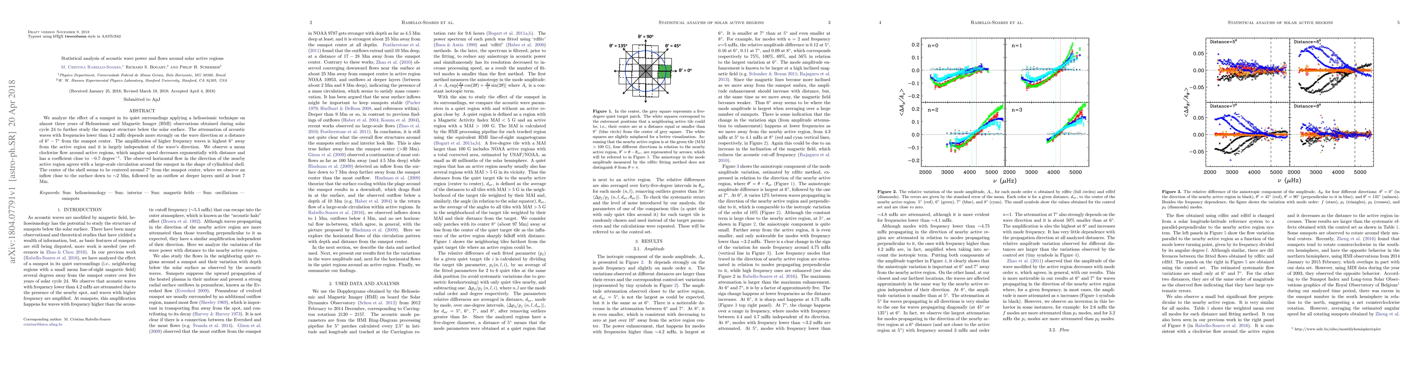 This study uses helioseismic data to analyze the impact of sunspots on acoustic wave power and flows, revealing stronger attenuation of low-frequency waves near the sunspot and amplification of higher frequencies 6° away. The research also observes a mean clockwise flow around active regions with an angular speed decreasing exponentially with distance.