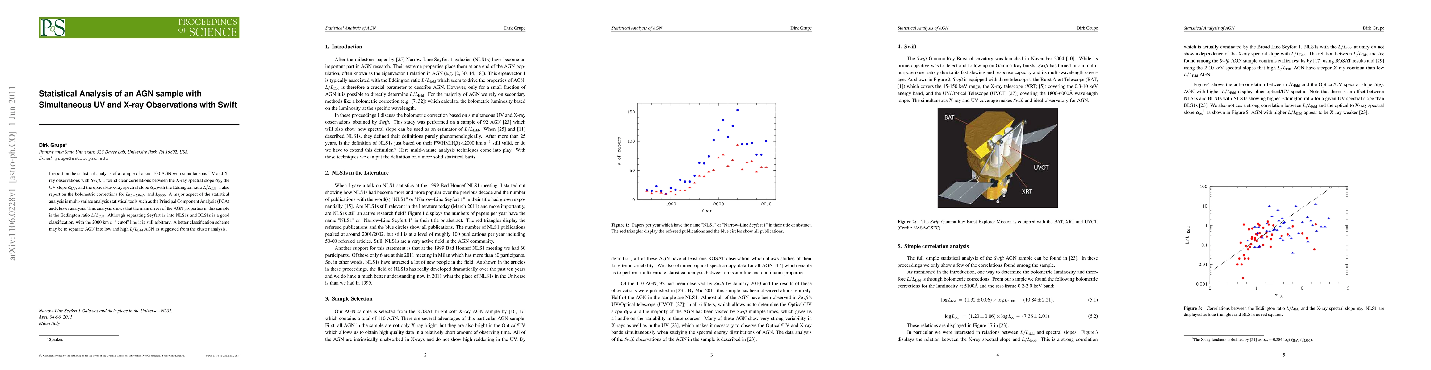 I report on the statistical analysis of a sample of about 100 AGN with simultaneous UV and X-ray observations with Swift. I found clear correlations between the X-ray spectral slope alpha-X, the UV slope alpha-UV, and the optical-to-x-ray spectral slope alpha-ox with the Eddington ratio L/Ledd. I also report on the bolometric corrections for L(0.2-2.0 keV) and L(5100A). A major aspect of the statistical analysis is multi-variate analysis statistical tools such as the Principal Component Analysis (PCA) and cluster analysis. This analysis shows that the main driver of the AGN properties in this sample is the Eddington ratio L/Ledd. Although separating Seyfert 1s into NLS1s and BLS1s is a good classification, with the 2000 km/s cutoff line it is still arbitrary. A better classification scheme may be to separate AGN into low and highL/Ledd AGN as suggested from the cluster analysis.
