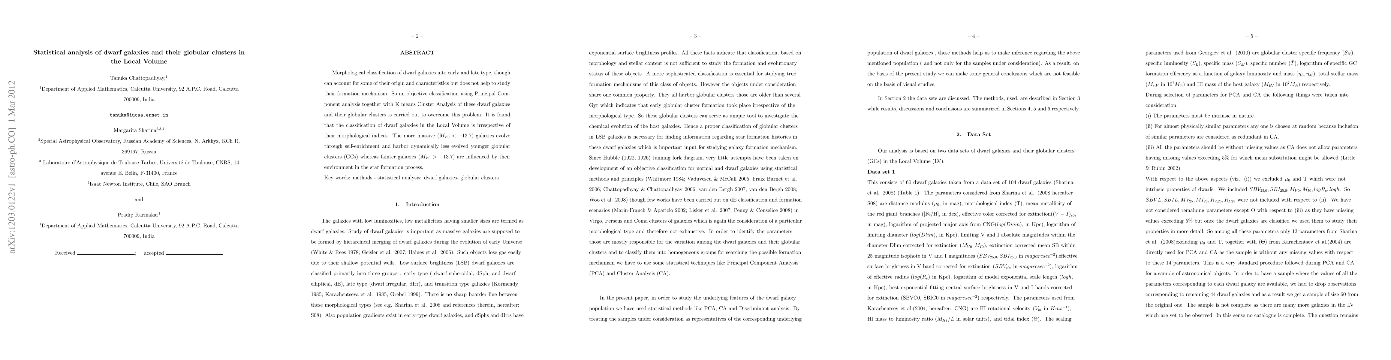 This paper uses Principal Component analysis and K means Cluster Analysis to classify dwarf galaxies in the Local Volume, finding that their classification is not dependent on morphology. It concludes that more massive galaxies exhibit self-enrichment and host younger globular clusters, while fainter galaxies are influenced by their environment in star formation.