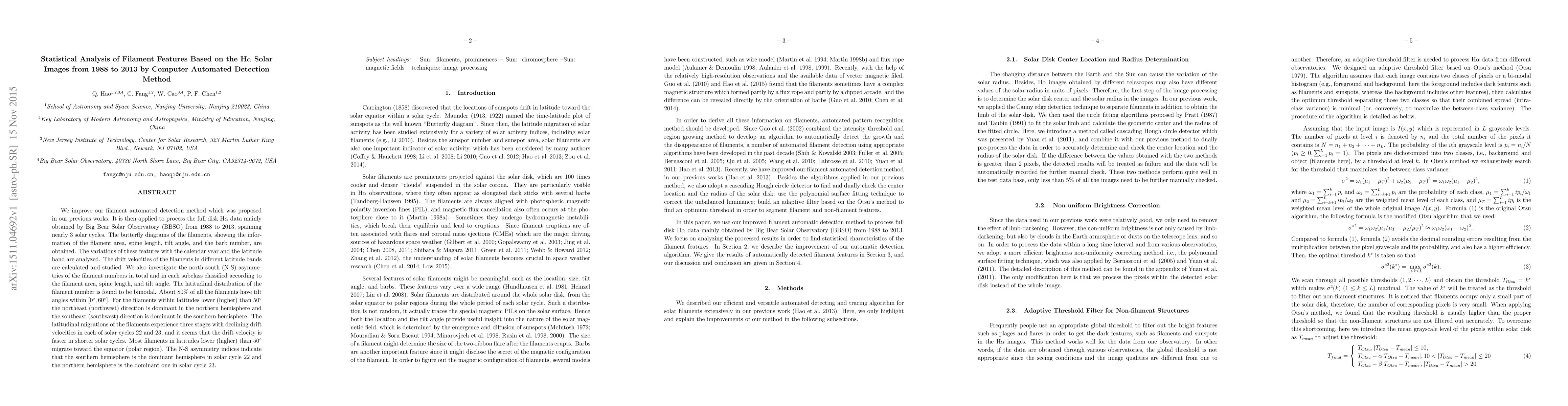This paper enhances an automated filament detection method to analyze Hα solar images from 1988 to 2013, revealing variations in filament features and drift velocities across solar cycles and latitudes, and identifying bimodal latitudinal distribution and north-south asymmetries in filament numbers.