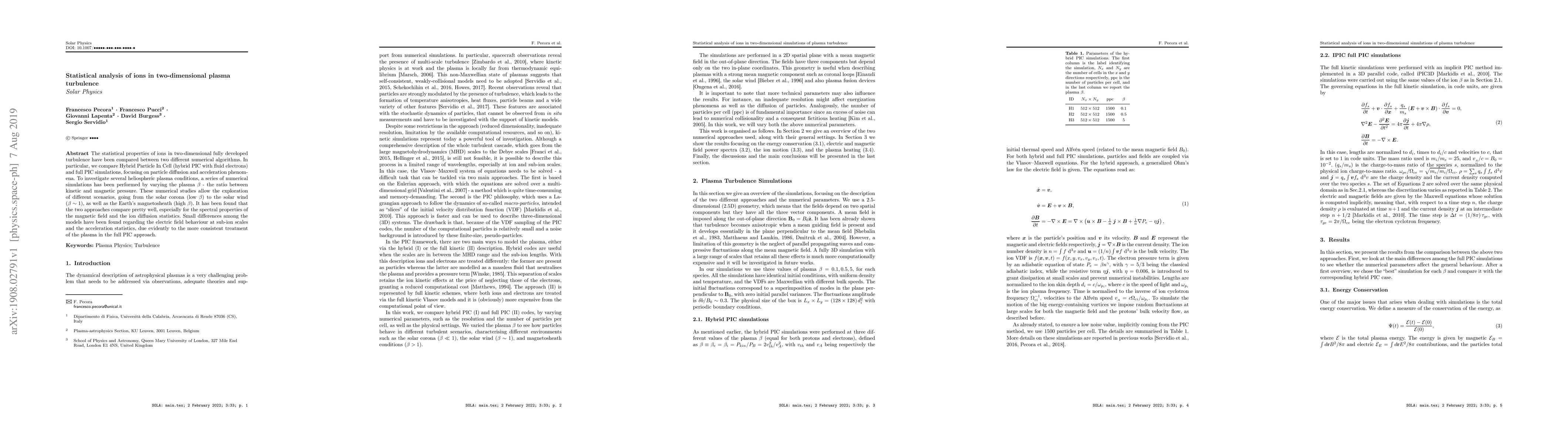 The statistical properties of ions in two-dimensional fully developed turbulence have been compared between two different numerical algorithms. In particular, we compare Hybrid Particle In Cell (hybrid PIC with fluid electrons) and full PIC simulations, focusing on particle diffusion and acceleration phenomena. To investigate several heliospheric plasma conditions, a series of numerical simulations has been performed by varying the plasma $\beta$ - the ratio between kinetic and magnetic pressure. These numerical studies allow the exploration of different scenarios, going from the solar corona (low $\beta$) to the solar wind ($\beta \sim 1$), as well as the Earth's magnetosheath (high $\beta$). It has been found that the two approaches compare pretty well, especially for the spectral properties of the magnetic field and the ion diffusion statistics. Small differences among the models have been found regarding the electric field behaviour at sub-ion scales and the acceleration statistics, due evidently to the more consistent treatment of the plasma in the full PIC approach.