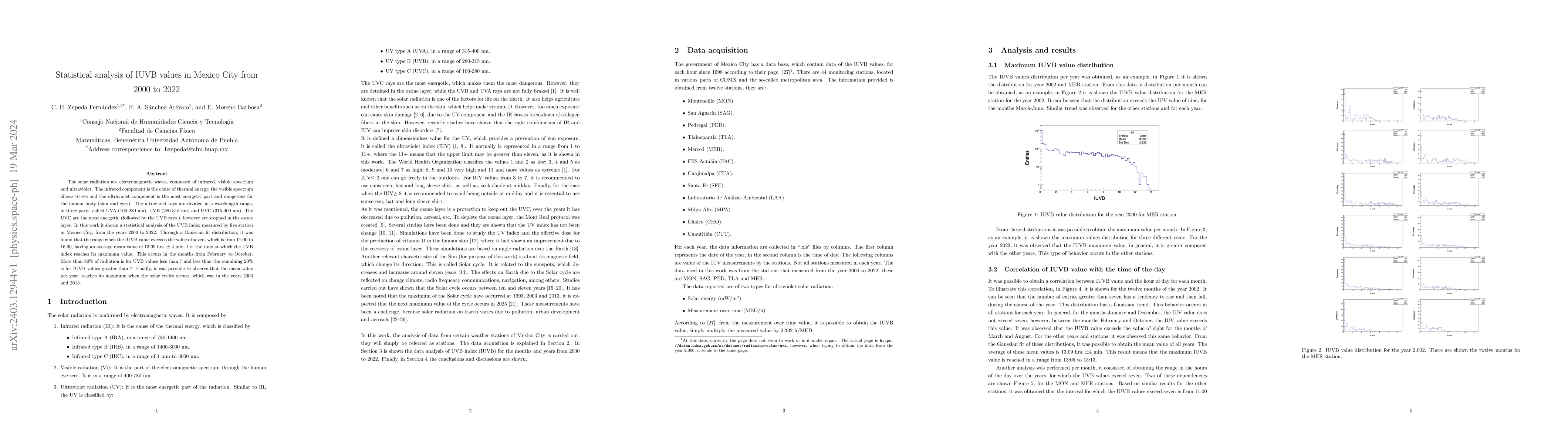 This study presents a statistical analysis of UVB index values measured in Mexico City from 2000 to 2022, showing that the maximum UVB index, often exceeding seven, occurs daily between 11:00 and 16:00, with an average peak time of 13:09 ± 4 min from February to October.