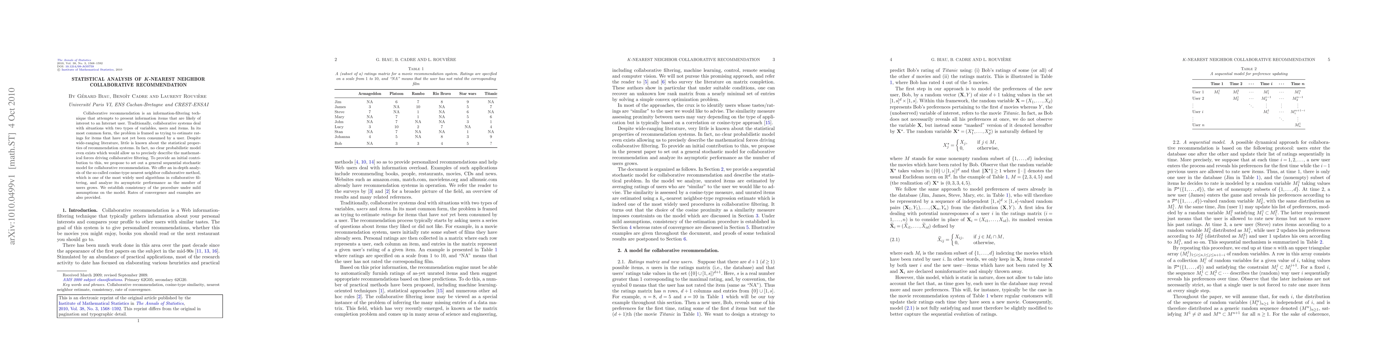 This paper proposes a general sequential stochastic model for collaborative recommendation, analyzing the performance of the cosine-type nearest neighbor algorithm as the number of users grows. It establishes consistency and convergence rates under mild assumptions.