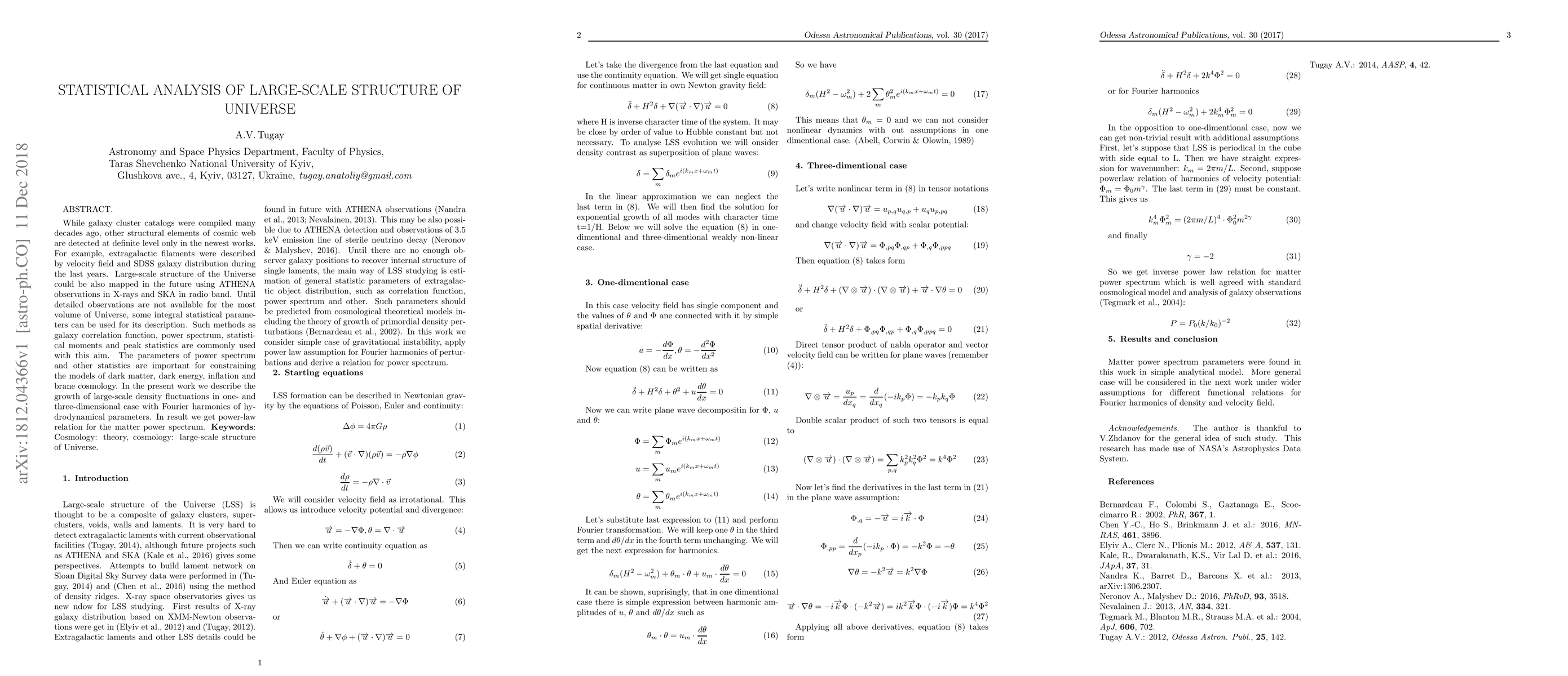 While galaxy cluster catalogs were compiled many decades ago, other structural elements of cosmic web are detected at definite level only in the newest works. For example, extragalactic filaments were described by velocity field and SDSS galaxy distribution during the last years. Large-scale structure of the Universe could be also mapped in the future using ATHENA observations in X-rays and SKA in radio band. Until detailed observations are not available for the most volume of Universe, some integral statistical parameters can be used for its description. Such methods as galaxy correlation function, power spectrum, statistical moments and peak statistics are commonly used with this aim. The parameters of power spectrum and other statistics are important for constraining the models of dark matter, dark energy, inflation and brane cosmology. In the present work we describe the growth of large-scale density fluctuations in one- and three-dimensional case with Fourier harmonics of hydrodynamical parameters. In result we get power-law relation for the matter power spectrum.
