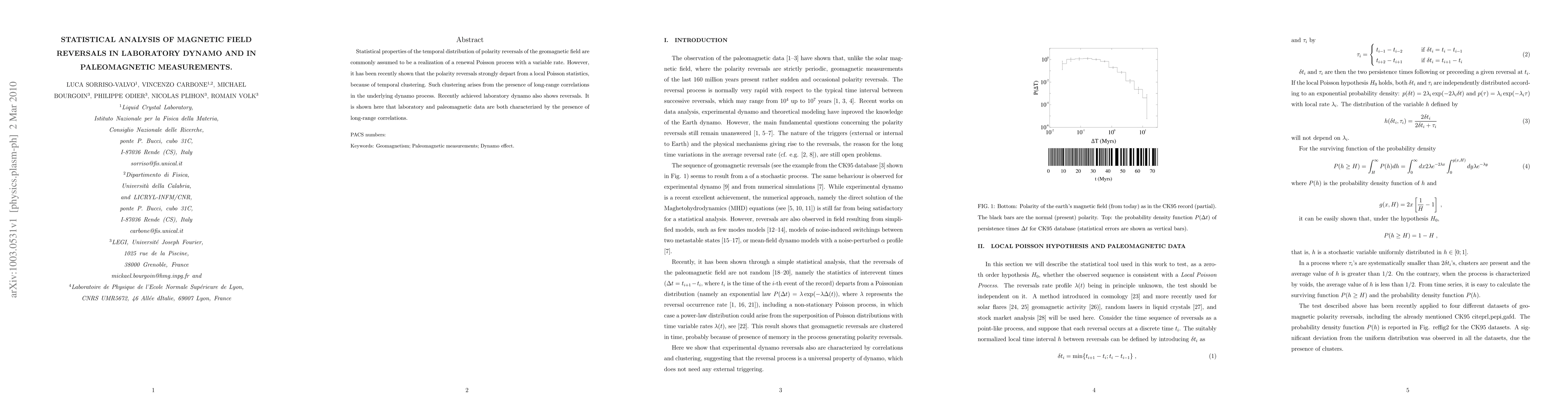 This paper investigates the statistical properties of geomagnetic polarity reversals, revealing that both laboratory dynamo and paleomagnetic data exhibit long-range correlations, deviating from a local Poisson process due to temporal clustering in reversals.
