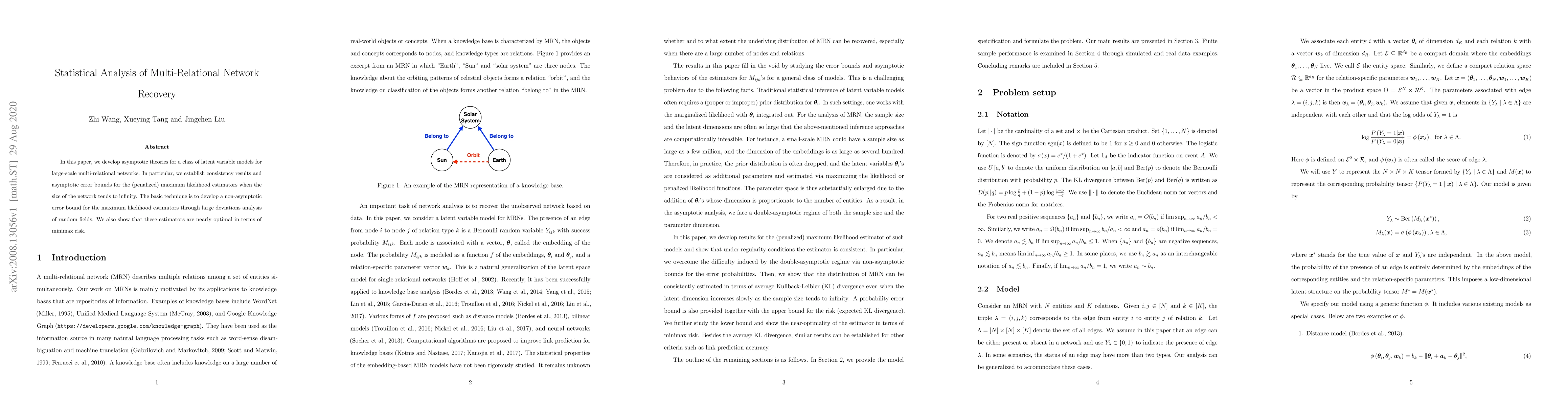 Researchers developed asymptotic theories for latent variable models of large-scale multi-relational networks, establishing consistency results and error bounds for maximum likelihood estimators as network size increases. These findings suggest that the estimators are nearly optimal in terms of minimax risk.