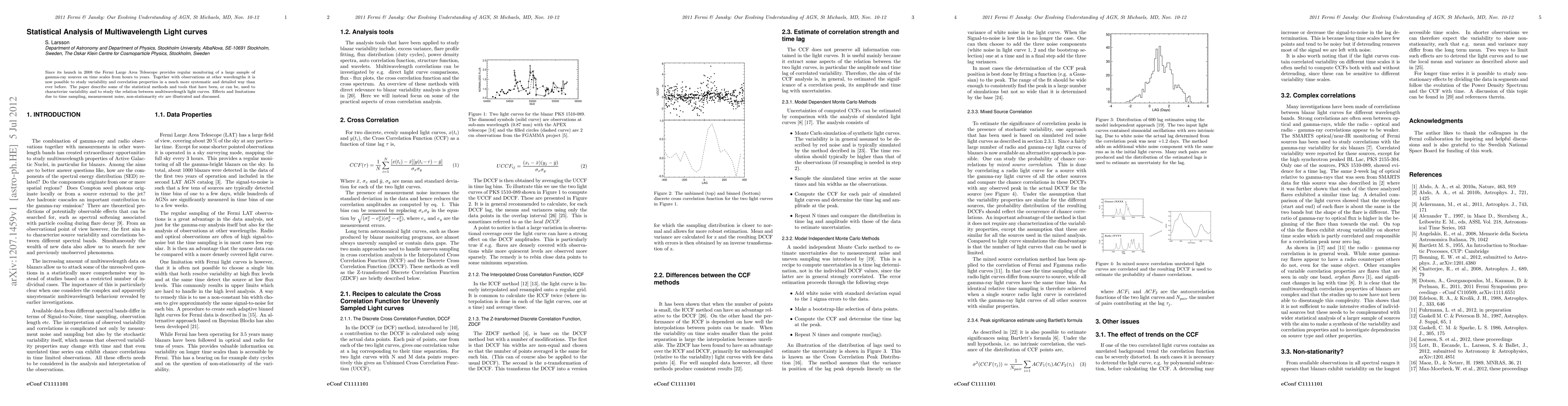 Since its launch in 2008 the Fermi Large Area Telescope provides regular monitoring of a large sample of gamma-ray sources on time scales from hours to years. Together with observations at other wavelengths it is now possible to study variability and correlation properties in a much more systematic and detailed way than ever before. The paper describe some of the statistical methods and tools that have been, or can be, used to characterize variability and to study the relation between multiwavelength light curves. Effects and limitations due to time sampling, measurement noise, non-stationarity etc are illustrated and discussed.