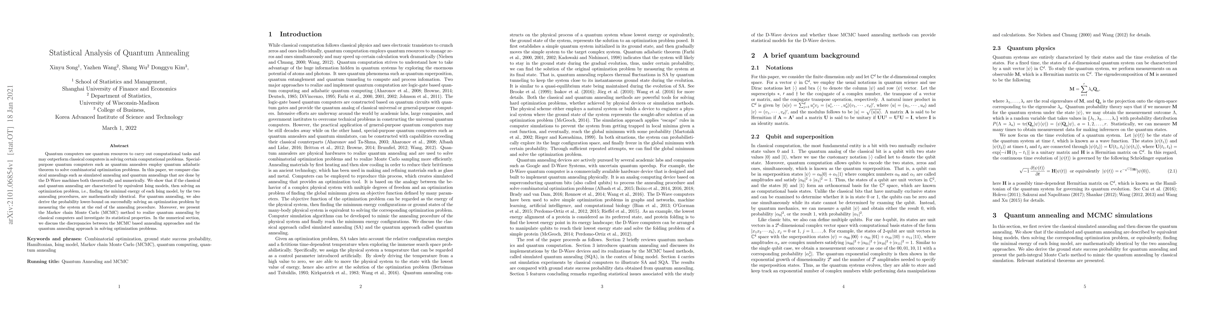 Quantum computers use quantum resources to carry out computational tasks and may outperform classical computers in solving certain computational problems. Special-purpose quantum computers such as quantum annealers employ quantum adiabatic theorem to solve combinatorial optimization problems. In this paper, we compare classical annealings such as simulated annealing and quantum annealings that are done by the D-Wave machines both theoretically and numerically. We show that if the classical and quantum annealing are characterized by equivalent Ising models, then solving an optimization problem, i.e., finding the minimal energy of each Ising model, by the two annealing procedures, are mathematically identical. For quantum annealing, we also derive the probability lower-bound on successfully solving an optimization problem by measuring the system at the end of the annealing procedure. Moreover, we present the Markov chain Monte Carlo (MCMC) method to realize quantum annealing by classical computers and investigate its statistical properties. In the numerical section, we discuss the discrepancies between the MCMC based annealing approaches and the quantum annealing approach in solving optimization problems.